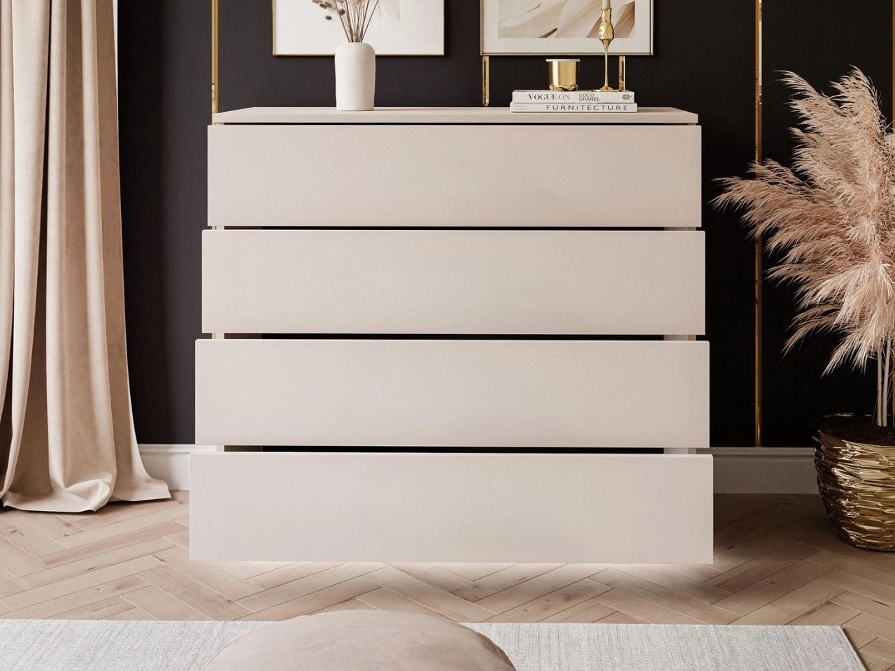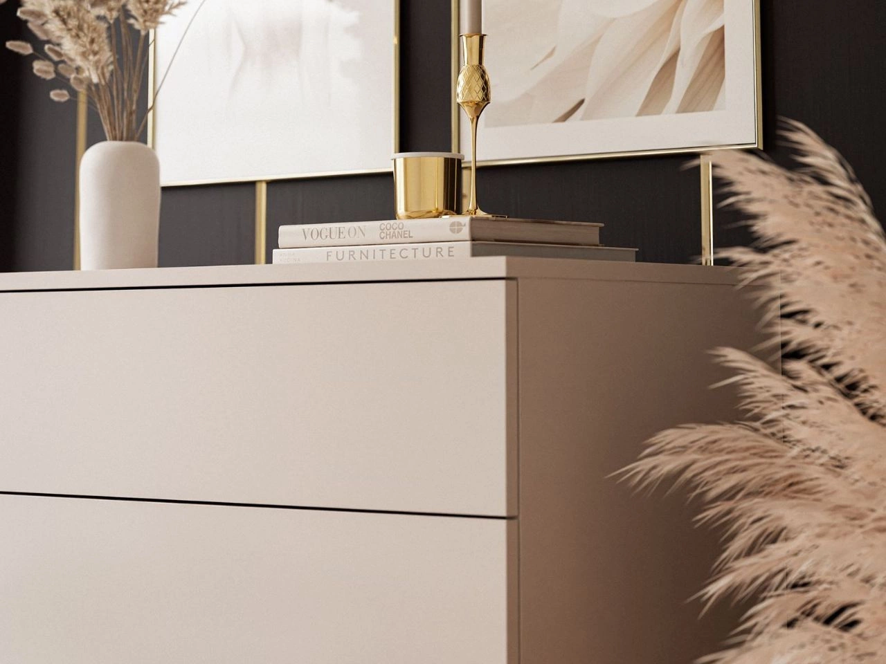Suchen Sie ein praktisches und stilvolles Möbelstück für Ihr Zuhause? Kaschmir Kommode Nuveo ist die ideale Lösung für Wohnzimmer, Schlafzimmer, Flur oder Jugendzimmer. Ihre moderne Form und die matte Ausführung vergrößern den Raum optisch und verleihen dem Interieur Leichtigkeit und Eleganz
