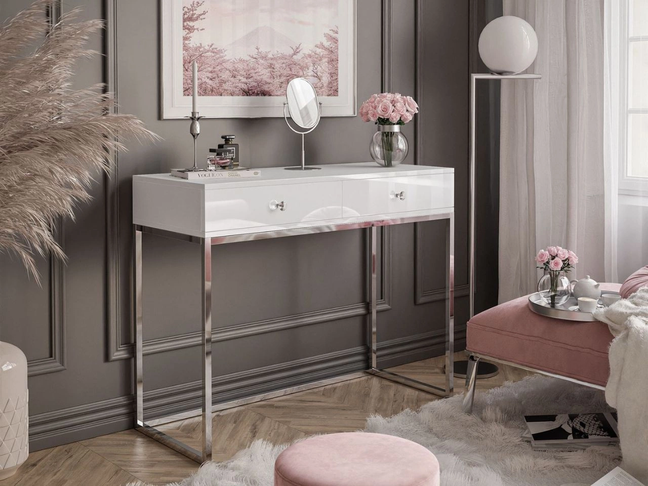 Konsolentisch mit Schubladen, silbernem Gestell und Kristallgriffen Brisa Weiß Hochglanz