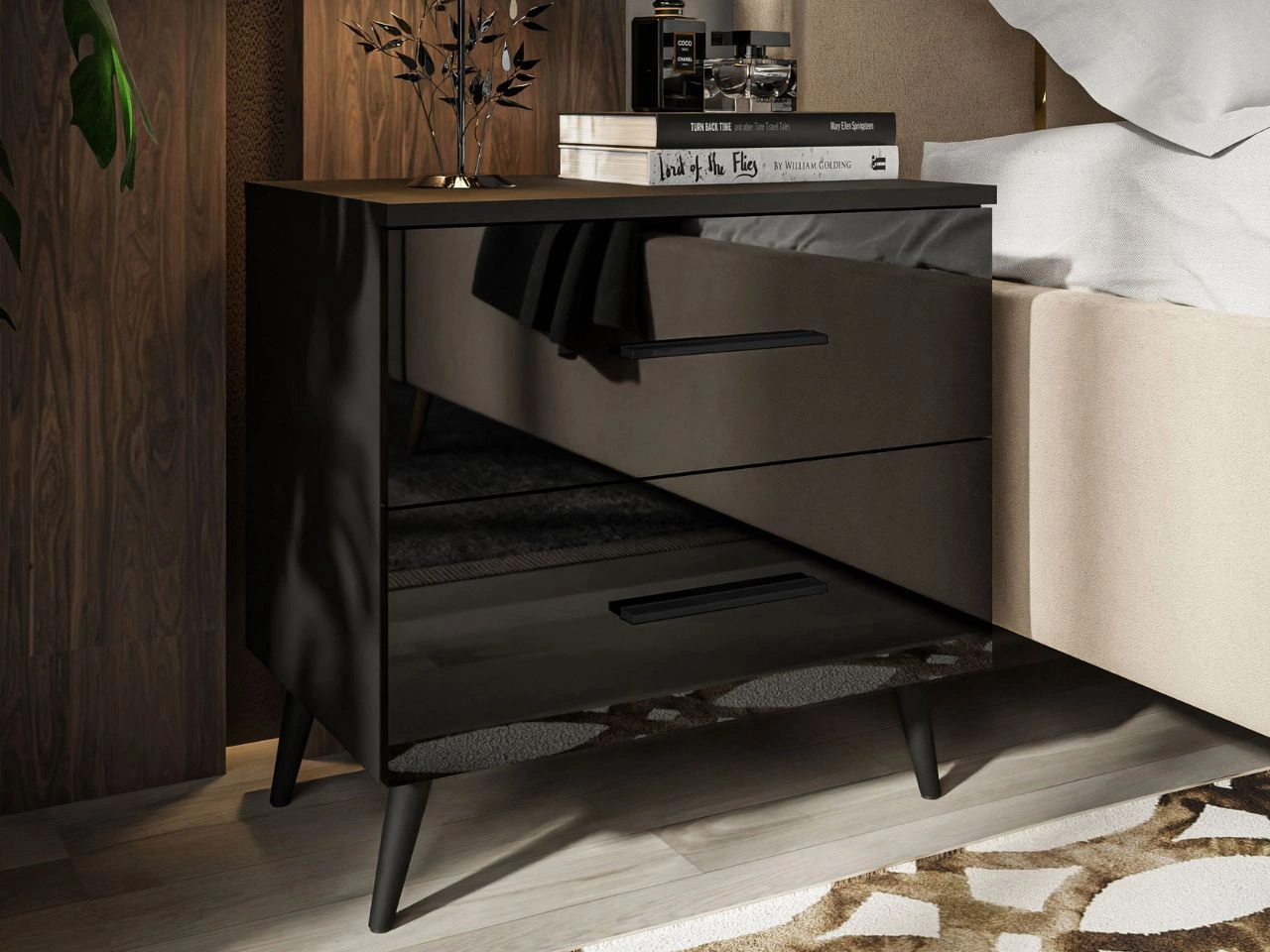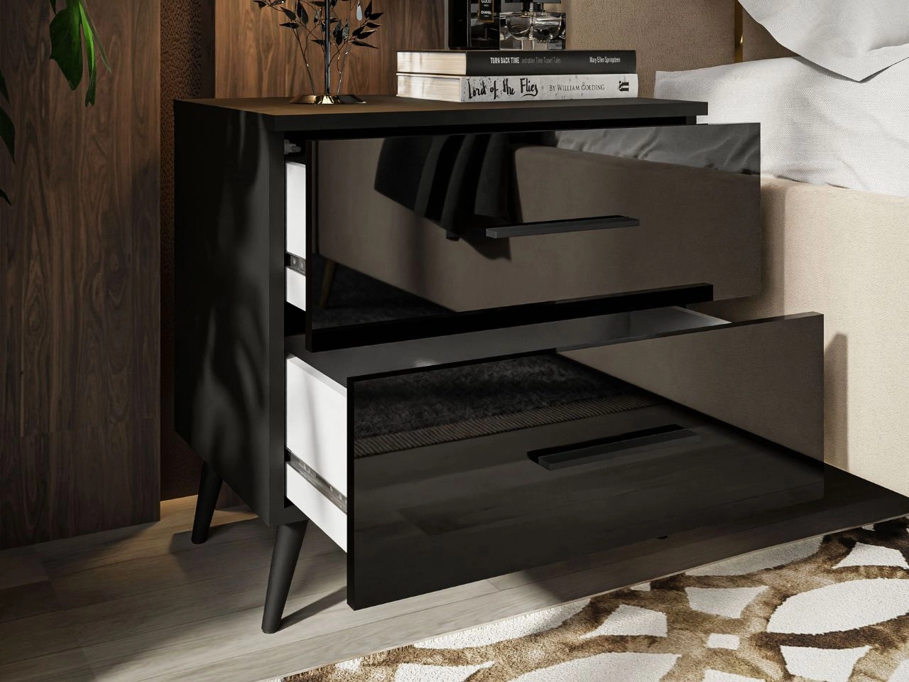 Nachttisch ist aus strapazierfähiger Laminatplatte gefertigt, seine Fronten bestehen aus MDF in Hochglanz, was den eleganten Charakter des Möbels unterstreicht und seine Beständigkeit im Gebrauch erhöht. Die Schubladenfronten sind mit einer ABS-Kante versehen, die für ein ansprechendes Finish sorgt und die Kanten zusätzlich vor Beschädigungen schützt. Die Schubladen sind auf soliden Kugelführungen montiert, die ein sanftes und komfortables Öffnen gewährleisten. Abgerundet wird das Ganze durch ergonomische Griffe, die eine bequeme Handhabung ermöglichen und zugleich ein dezentes Designdetail darstellen. Getragen wird die Konstruktion von Beinen, die dem Möbelstück Leichtigkeit verleihen und das Reinigen erleichtern.