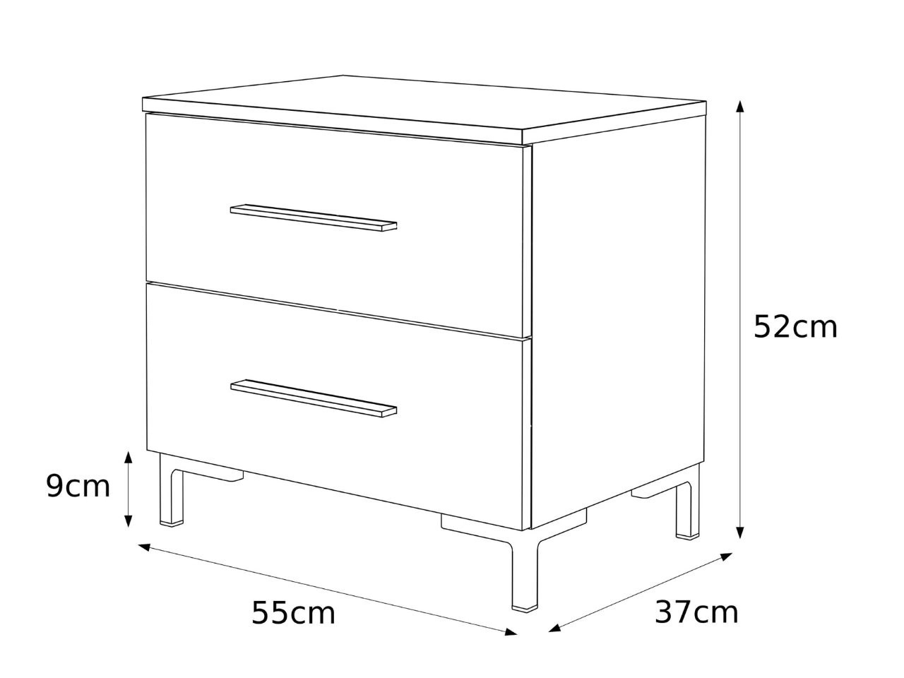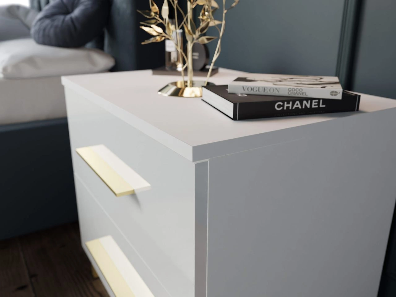 Nachttisch wurde aus einer strapazierfähigen laminierten Platte gefertigt, während die Fronten aus MDF-Platte in Hochglanz bestehen, was den eleganten Charakter des Möbels unterstreicht und seine Widerstandsfähigkeit im Gebrauch erhöht. Die Schubladenfronten sind mit einer ABS-Kante versehen, die ihnen ein ästhetisches Finish verleiht und die Kanten zusätzlich vor Beschädigungen schützt. Die Schubladen sind auf soliden Kugelführungen montiert, die ein sanftes und komfortables Öffnen gewährleisten. Abgerundet wird das Ganze durch ergonomische Griffe, die eine bequeme Handhabung ermöglichen und zugleich ein dezentes Designdetail darstellen. Getragen wird die Konstruktion von Beinen, die dem Möbelstück Leichtigkeit verleihen und das Reinigen erleichtern.