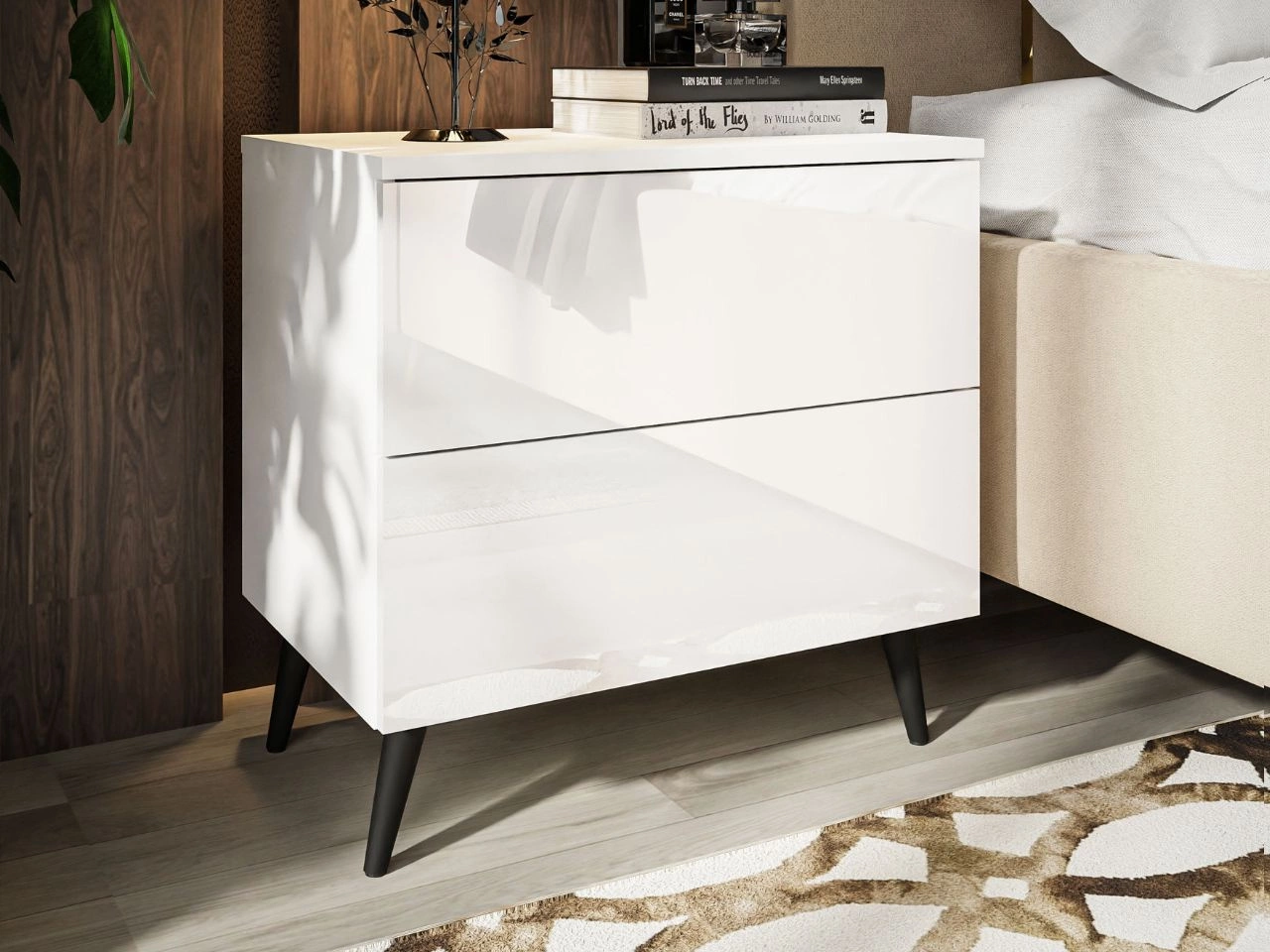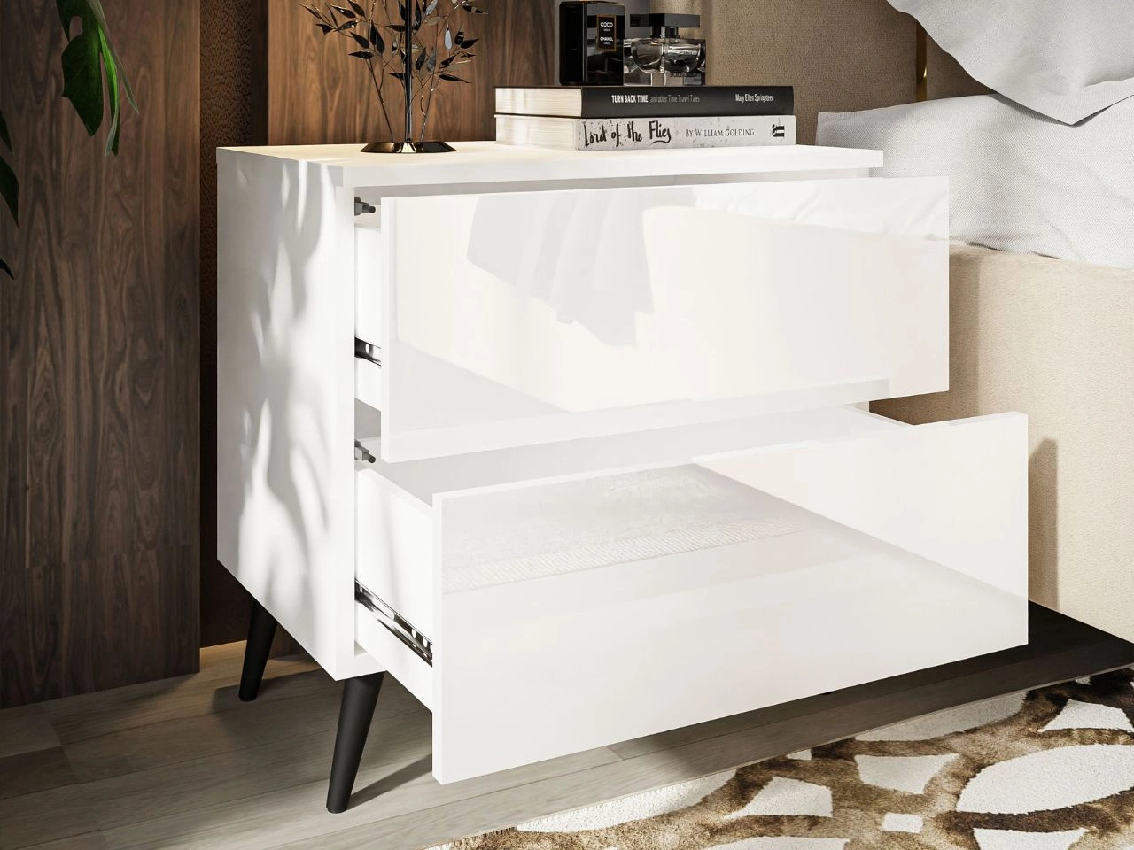 Nachttisch wurde aus einer strapazierfähigen laminierten Platte gefertigt, während die Fronten aus MDF-Platte in Hochglanz bestehen, was den eleganten Charakter des Möbels unterstreicht und seine Widerstandsfähigkeit im Gebrauch erhöht. Die Schubladenfronten sind mit einer ABS-Kante versehen, die ihnen ein ästhetisches Finish verleiht und die Kanten zusätzlich vor Beschädigungen schützt. Die Schubladen sind auf soliden Kugelführungen montiert, die ein sanftes und komfortables Öffnen gewährleisten. Das integrierte PUSH-TO-OPEN-System ermöglicht ein griffloses Öffnen der Fronten und fügt sich perfekt in die aktuellen Trends des minimalistischen Designs ein. Abgerundet wird die Konstruktion durch hohe Metallbeine, die dem Möbelstück Leichtigkeit verleihen und die Reinigung erleichtern.