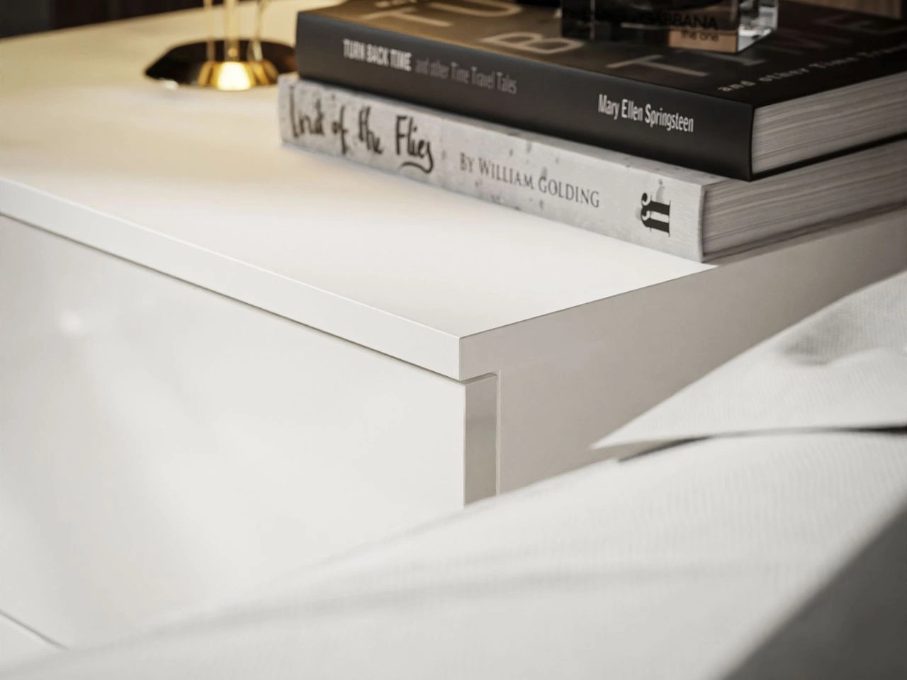 Suchen Sie nach einer praktischen und stilvollen Ergänzung für Ihr Schlafzimmer? Nachttisch Nuveo ist die ideale Lösung, die die Organisation erleichtert und die Raumgestaltung abrundet. Seine zeitgemäße Form und die Hochglanz-Ausführung vergrößern den Raum optisch und verleihen dem Ganzen Leichtigkeit sowie einen eleganten Charakter.