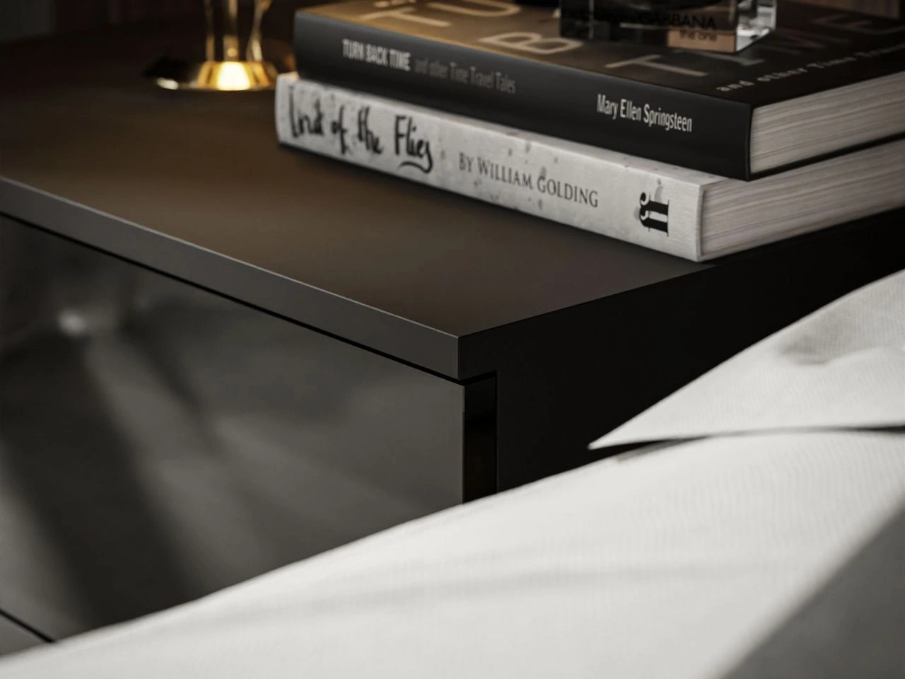 Nachttisch wurde aus einer strapazierfähigen laminierten Platte gefertigt, während die Fronten aus MDF-Platte in Hochglanz bestehen, was den eleganten Charakter des Möbels unterstreicht und seine Widerstandsfähigkeit im Gebrauch erhöht. Die Schubladenfronten sind mit einer ABS-Kante versehen, die ihnen ein ästhetisches Finish verleiht und die Kanten zusätzlich vor Beschädigungen schützt. Die Schubladen sind auf soliden Kugelführungen montiert, die ein sanftes und komfortables Öffnen gewährleisten. Das integrierte PUSH-TO-OPEN-System ermöglicht ein griffloses Öffnen der Fronten und fügt sich perfekt in die aktuellen Trends des minimalistischen Designs ein. Abgerundet wird die Konstruktion durch hohe Metallbeine, die dem Möbelstück Leichtigkeit verleihen und die Reinigung erleichtern.
