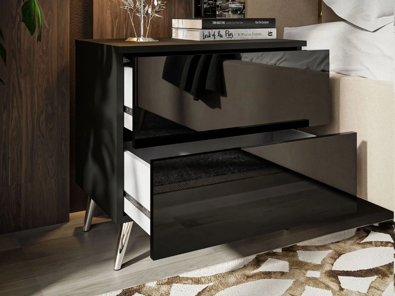 Nachttisch mit Schubladen auf Silbernen Metallbeinen Nuveo Schwarz Hochglanz