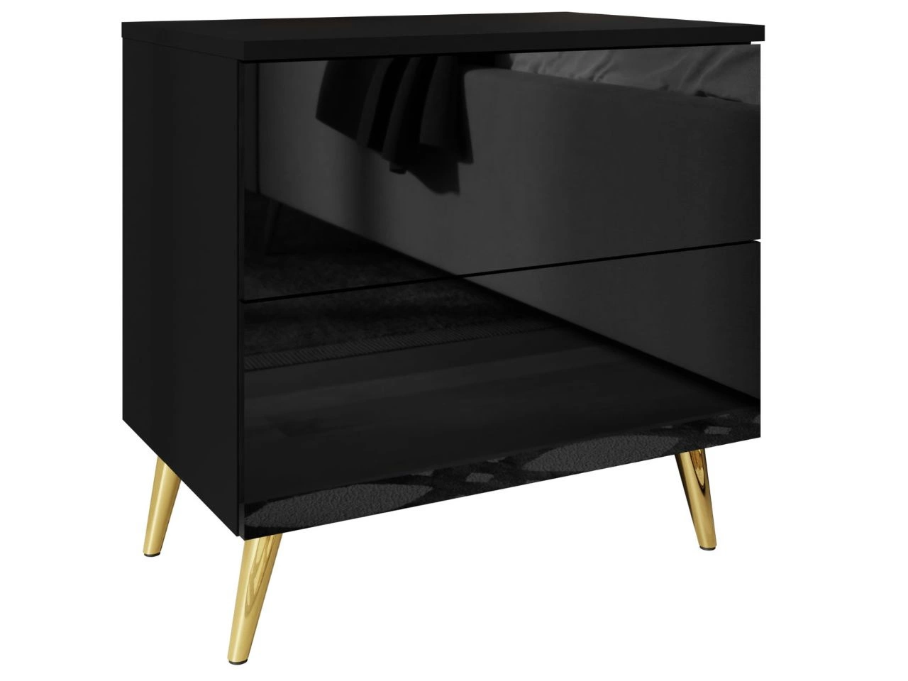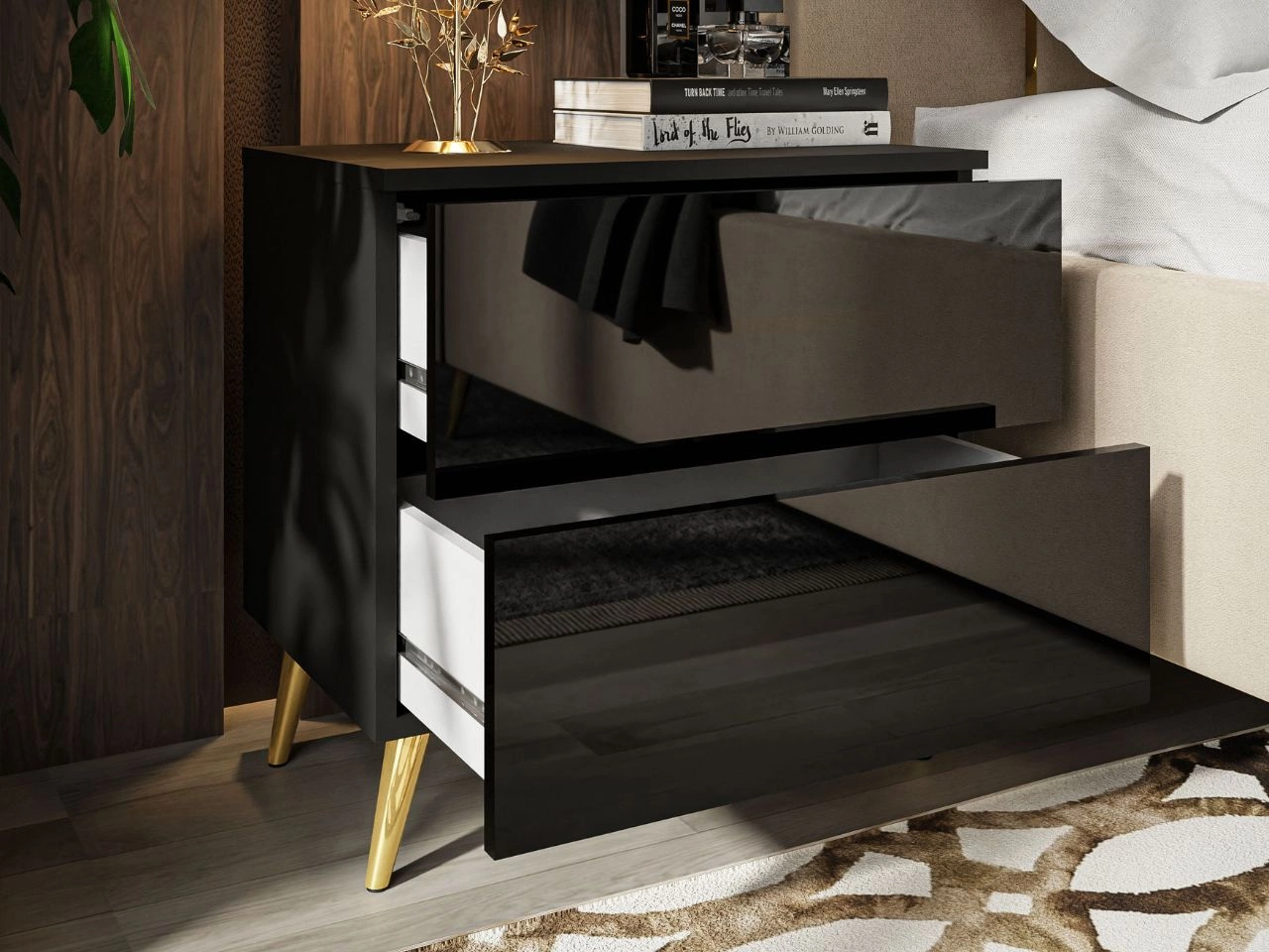 Nachttisch mit Schubladen auf Goldenen Metallbeinen Nuveo Schwarz Hochglanz