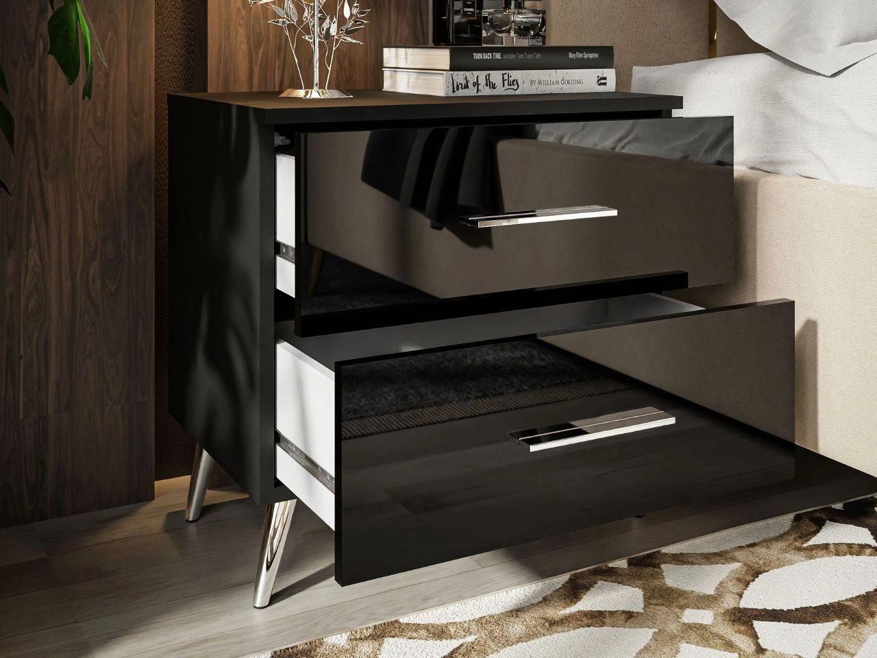 Du ziehst an: Nachttisch mit Schubladen auf Silbernen Metallbeinen Nuveo Schwarz Hochglanz