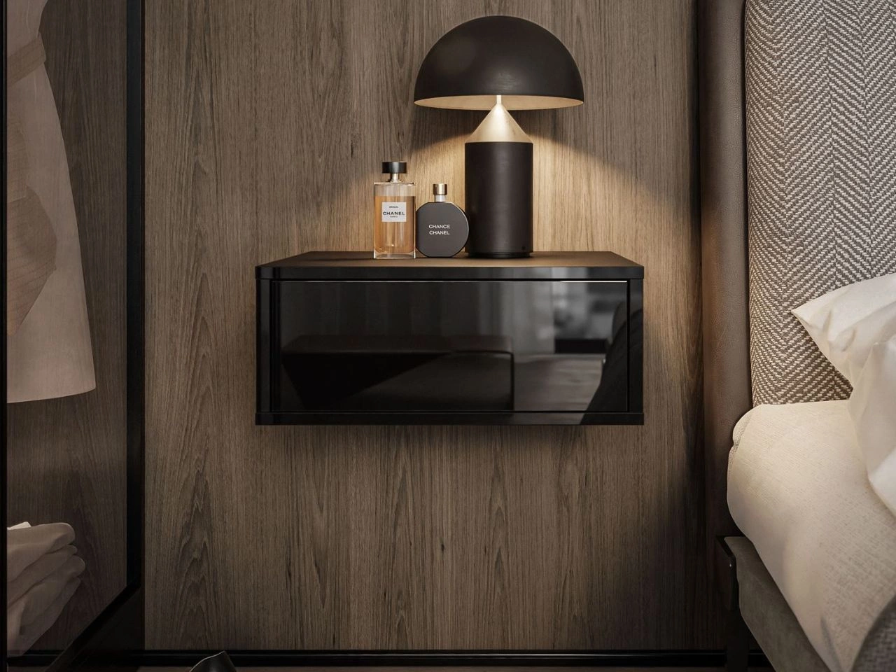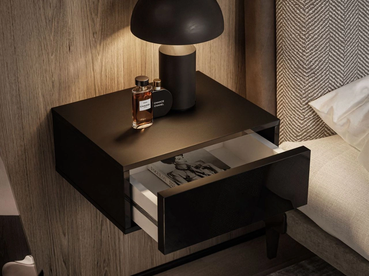 Der hängende Nachtschrank Brisa ist ein kompaktes Möbelstück mit minimalistischem Charakter. Die Front wurde in Schwarz Hochglanz ausgeführt, im Kontrast zum matten Korpus. Hinter der Front verbirgt sich eine praktische Schublade, die auf kugelgelagerten Führungen läuft und mit dem PUSH-TO-OPEN-System geöffnet wird – drücken zum Öffnen.