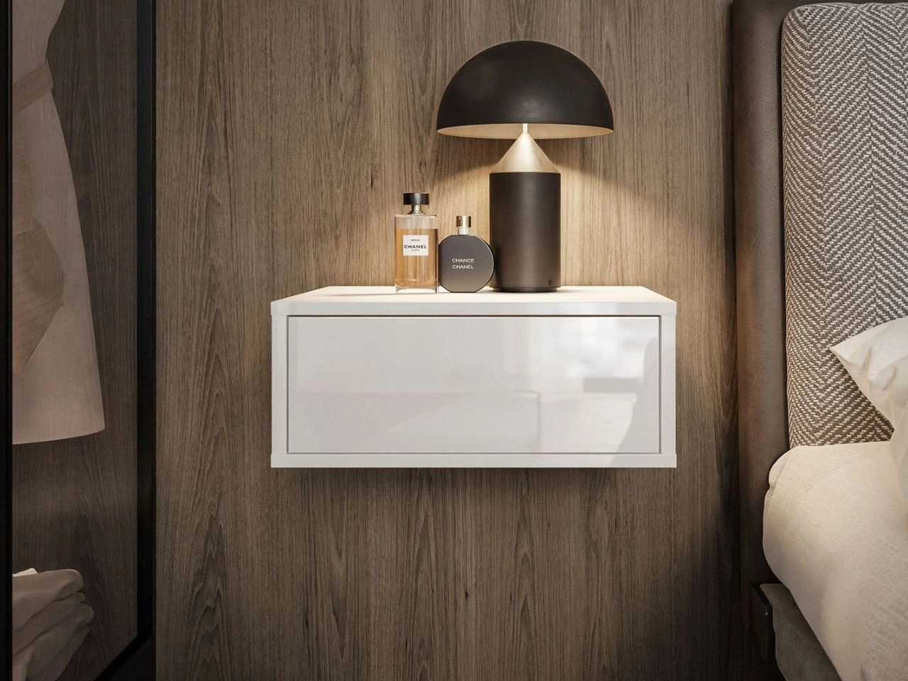 Du ziehst an: Hängender Nachttisch mit Schublade und LED-Beleuchtung Brisa Weiß Hochglanz