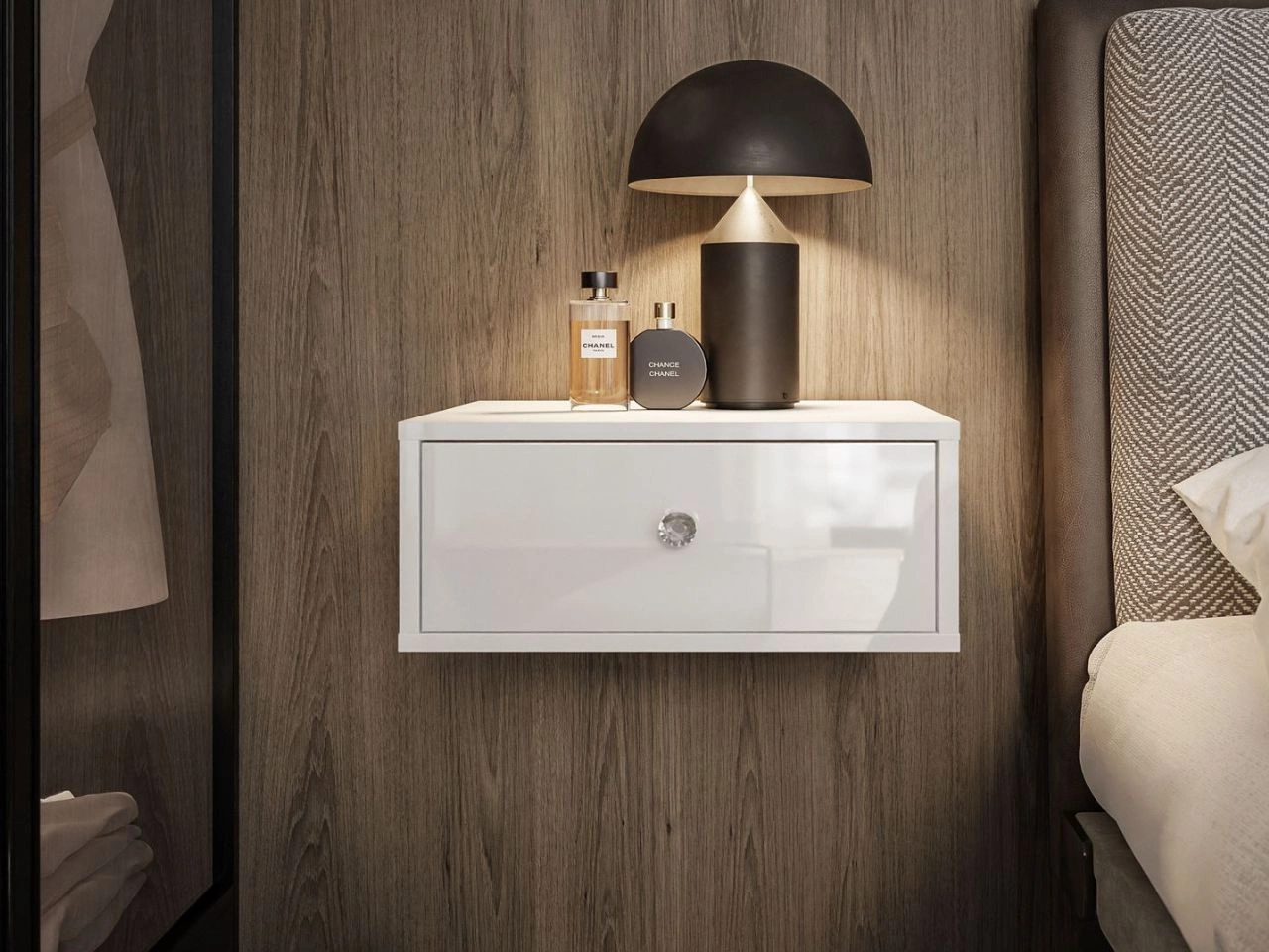 Der hängende Nachtschrank Brisa ist ein kompaktes Möbelstück mit minimalistischem Charakter. Die Front wurde in Weiß Hochglanz ausgeführt, im Kontrast zum matten Korpus. Hinter der Front verbirgt sich eine praktische Schublade, die auf kugelgelagerten Führungen läuft und mit einem Kristallgriff geöffnet wird. Ein zusätzlicher Vorteil dieses Modells ist die dezente LED-Beleuchtung, die an der Unterseite des Schranks angebracht ist.