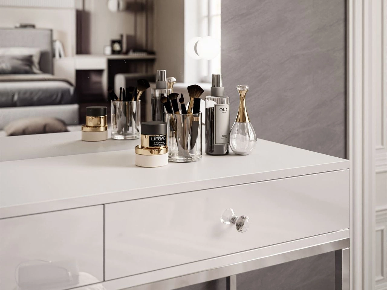 Der Schminktisch Brisa bietet mehrere praktische Lösungen, wie etwa den bereits erwähnten Spiegel mit LED-Beleuchtung. Es wurden 12 Lichtpunkte mit natürlicher Lichtfarbe angebracht, die die Augen nicht ermüden. Die Beleuchtung wird über eine Steckdose mit dem beiliegenden Kabel betrieben. Der Schminktisch ist außerdem mit zwei Schubladen ausgestattet, die über kristallene Griffe geöffnet werden. Kugelgelagerte Führungen ermöglichen dabei einen vollständigen Auszug.