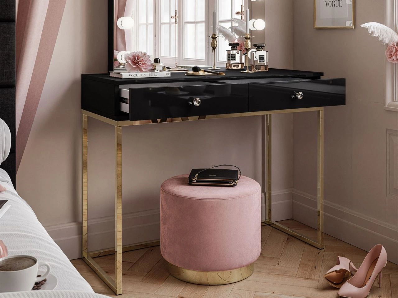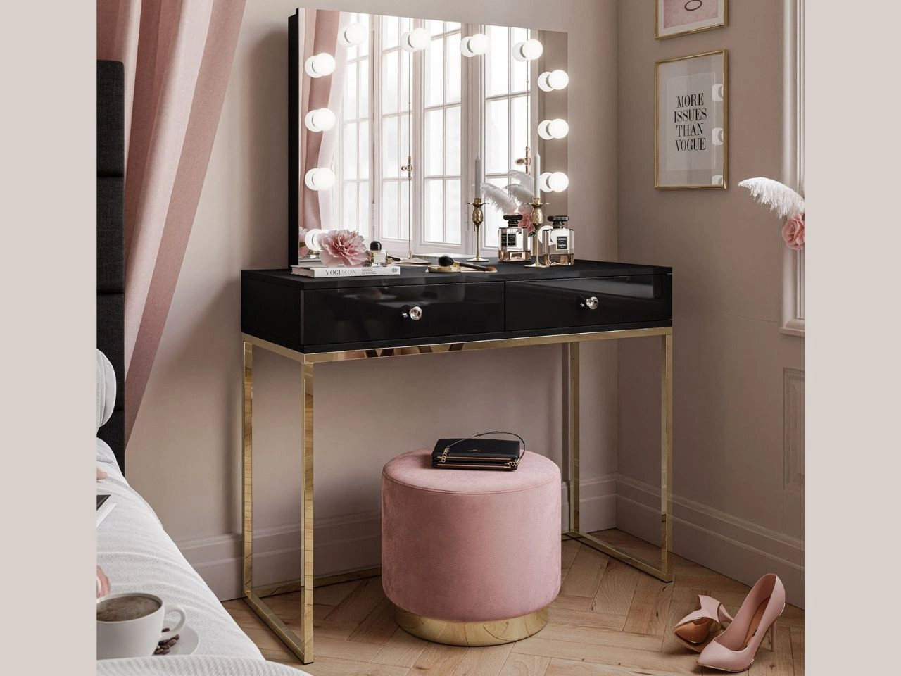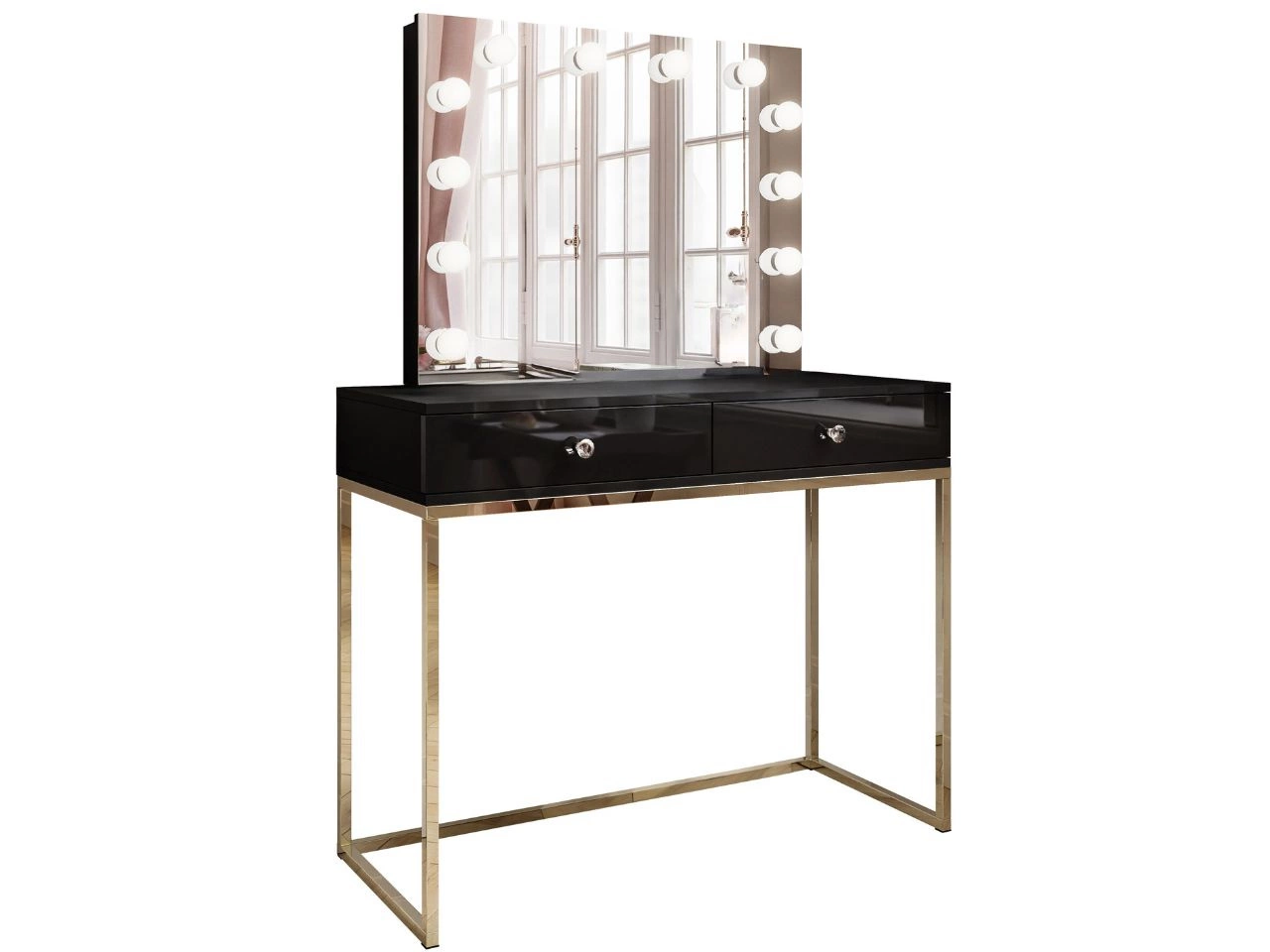 Der schwarze Schminktisch Brisa mit Spiegel und LED-Beleuchtung ist ein sehr ästhetisch gefertigtes Möbelstück, das sich hervorragend in unterschiedlichste Einrichtungen einfügt. Der Korpus und der Rahmen des Spiegels bestehen aus matter laminierter Platte. Die Fronten sind in Hochglanz ausgeführt. Das Ganze steht auf einem goldenen Metallgestell, das nicht nur gut aussieht, sondern auch die notwendige Stabilität gewährleistet.
