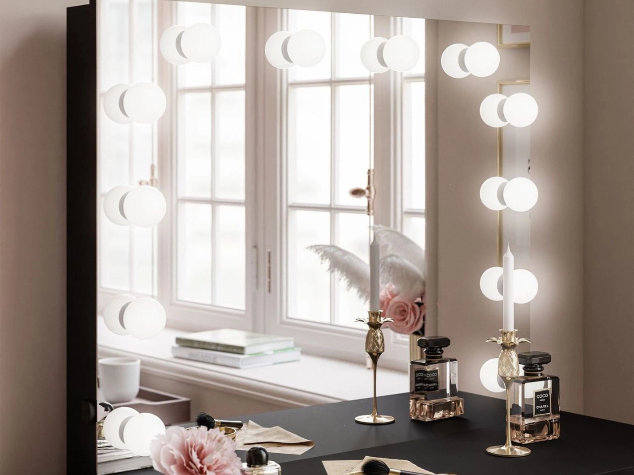 Der Schminktisch Brisa bietet mehrere praktische Lösungen, wie etwa den bereits erwähnten Spiegel mit LED-Beleuchtung. Es wurden 12 Lichtpunkte mit natürlicher Lichtfarbe angebracht, die die Augen nicht ermüden. Die Beleuchtung wird über eine Steckdose mit dem beiliegenden Kabel betrieben. Der Schminktisch ist außerdem mit zwei Schubladen ausgestattet, die über kristallene Griffe geöffnet werden. Kugelgelagerte Führungen ermöglichen dabei einen vollständigen Auszug.