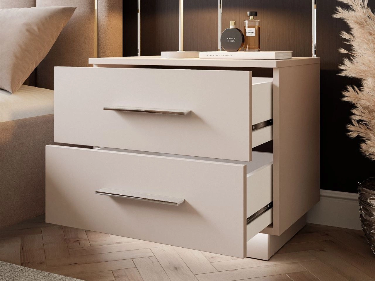 Nachttisch ist aus strapazierfähiger matter Laminatplatte gefertigt, was den eleganten Charakter des Möbels unterstreicht und seine Beständigkeit im Gebrauch erhöht. Die Schubladenfronten sind mit einer ABS-Kante versehen, die für ein ansprechendes Finish sorgt und die Kanten zusätzlich vor Beschädigungen schützt. Die Schubladen sind auf soliden Kugelführungen montiert, die ein sanftes und komfortables Öffnen gewährleisten. Abgerundet wird das Ganze durch ergonomische Griffe, die eine bequeme Handhabung ermöglichen und zugleich ein dezentes Designdetail darstellen. Zurückgesetzte Sockel unter der Konstruktion verleiht dem Möbelstück eine optische Leichtigkeit und erleichtert die Reinigung.