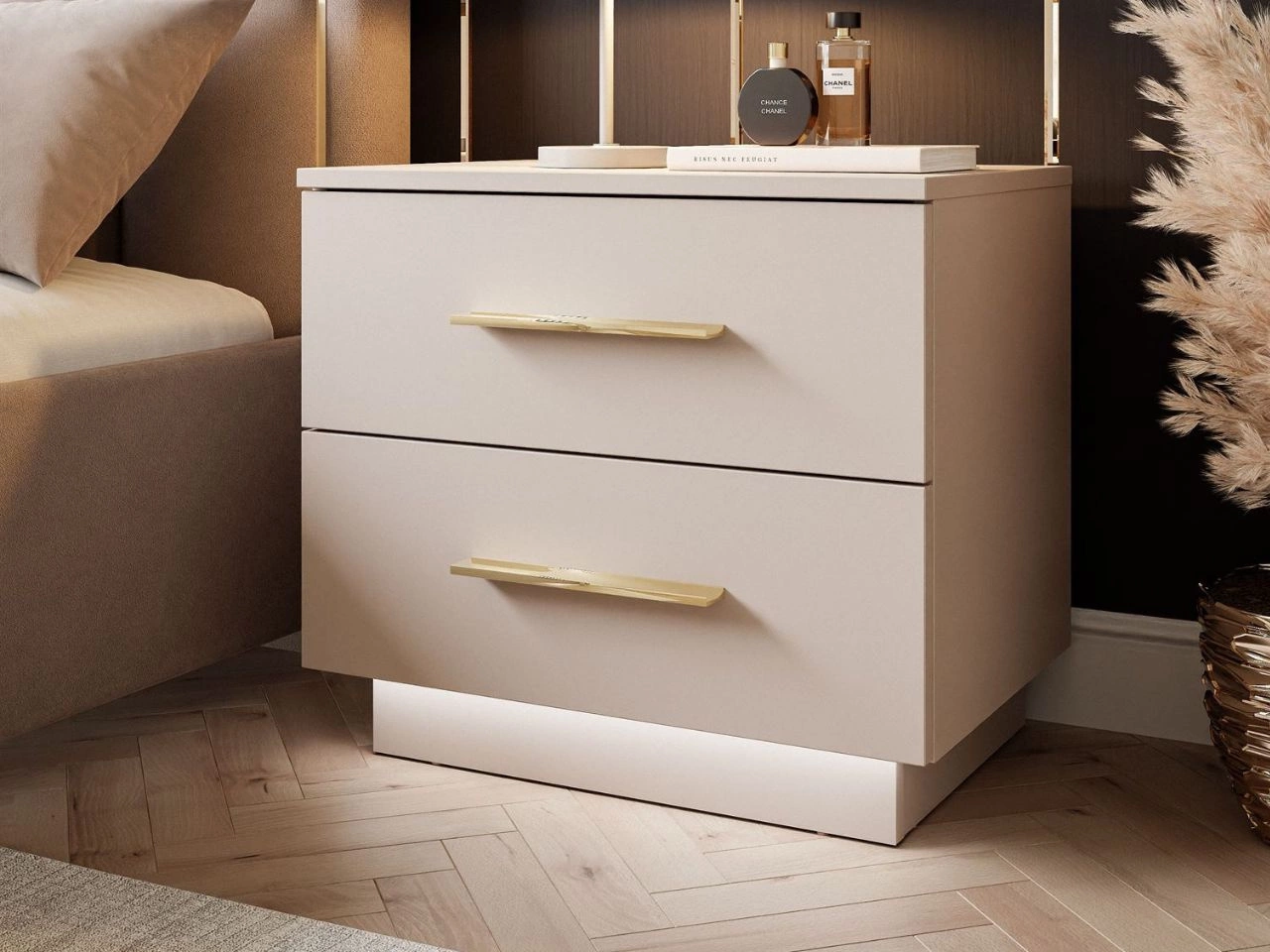 Nachttisch ist aus strapazierfähiger matter Laminatplatte gefertigt, was den eleganten Charakter des Möbels unterstreicht und seine Beständigkeit im Gebrauch erhöht. Die Schubladenfronten sind mit einer ABS-Kante versehen, die für ein ansprechendes Finish sorgt und die Kanten zusätzlich vor Beschädigungen schützt. Die Schubladen sind auf soliden Kugelführungen montiert, die ein sanftes und komfortables Öffnen gewährleisten. Abgerundet wird das Ganze durch ergonomische Griffe, die eine bequeme Handhabung ermöglichen und zugleich ein dezentes Designdetail darstellen. Zurückgesetzte Sockel unter der Konstruktion verleiht dem Möbelstück eine optische Leichtigkeit und erleichtert die Reinigung.