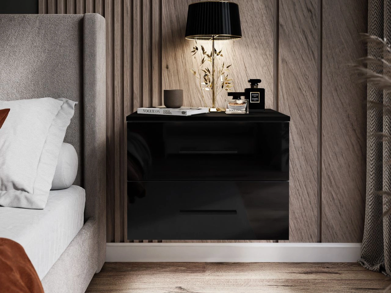 Nachttisch besteht aus einer robusten laminierten Platte, während die Fronten aus MDF-Platte im Hochglanz gefertigt sind, was den eleganten Charakter des Möbels unterstreicht und seine Widerstandsfähigkeit im Gebrauch erhöht. Die Schubladenfronten sind mit ABS-Kanten versehen, die für eine ästhetische Verarbeitung sorgen und die Kanten zusätzlich vor Beschädigungen schützen. Die Schubladen laufen auf langlebigen Kugelführungen, die für leises und reibungsloses Öffnen sorgen. Griffe erhöht den Bedienkomfort und betont den modernen Charakter des Möbelstücks. Die hängende Konstruktion des Nachttisches verleiht ihm Leichtigkeit und Eleganz und erleichtert zugleich die Reinigung des Bodens darunter.