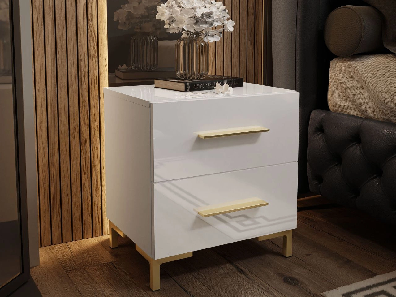 Nachttisch mit zwei Schubladen auf Goldenen Beinen Nuveo Lux Weiß Hochglanz