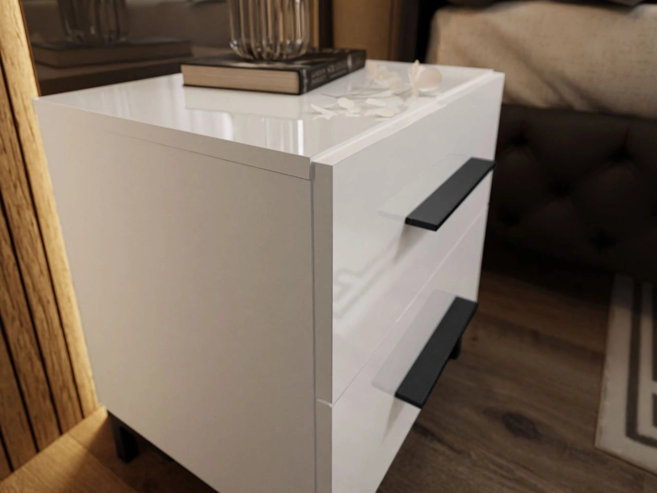 Nachttisch ist aus strapazierfähiger Laminatplatte gefertigt, was den eleganten Charakter des Möbels unterstreicht und seine Beständigkeit im Gebrauch erhöht. Die Schubladenfronten sind mit einer ABS-Kante versehen, die für ein ansprechendes Finish sorgt und die Kanten zusätzlich vor Beschädigungen schützt. Die Schubladen sind auf soliden Kugelführungen montiert, die ein sanftes und komfortables Öffnen gewährleisten. Verwendeten Griffe ermöglichen ein komfortables Öffnen der Fronten und unterstreichen den modernen Charakter des Möbels, passend zu den aktuellen Designtrends. Getragen wird die Konstruktion von Beinen, die dem Möbelstück Leichtigkeit verleihen und das Reinigen erleichtern.
