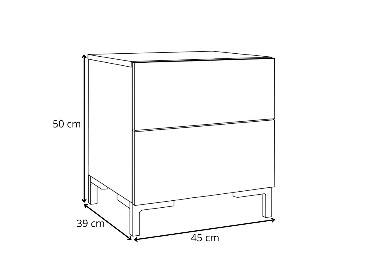 Nachttisch ist aus strapazierfähiger Laminatplatte gefertigt, was den eleganten Charakter des Möbels unterstreicht und seine Beständigkeit im Gebrauch erhöht. Die Schubladenfronten sind mit einer ABS-Kante versehen, die für ein ansprechendes Finish sorgt und die Kanten zusätzlich vor Beschädigungen schützt. Die Schubladen sind auf soliden Kugelführungen montiert, die ein sanftes und komfortables Öffnen gewährleisten. Das integrierte PUSH-TO-OPEN-System ermöglicht ein griffloses Öffnen der Fronten und fügt sich perfekt in die aktuellen Trends des minimalistischen Designs ein. Getragen wird die Konstruktion von Beinen, die dem Möbelstück Leichtigkeit verleihen und das Reinigen erleichtern.