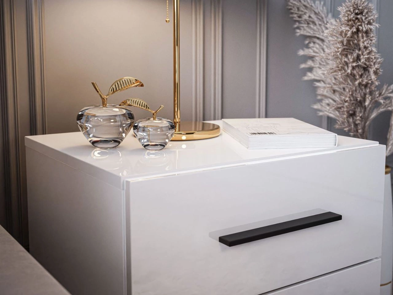 Nachttisch ist aus strapazierfähiger Laminatplatte gefertigt, was den eleganten Charakter des Möbels unterstreicht und seine Beständigkeit im Gebrauch erhöht. Die Schubladenfronten sind mit einer ABS-Kante versehen, die für ein ansprechendes Finish sorgt und die Kanten zusätzlich vor Beschädigungen schützt. Die Schubladen sind auf soliden Kugelführungen montiert, die ein sanftes und komfortables Öffnen gewährleisten. Verwendeten Griffe ermöglichen ein komfortables Öffnen der Fronten und unterstreichen den modernen Charakter des Möbels, passend zu den aktuellen Designtrends. Zurückgesetzte Sockel unter der Konstruktion verleiht dem Möbelstück eine optische Leichtigkeit und erleichtert die Reinigung.