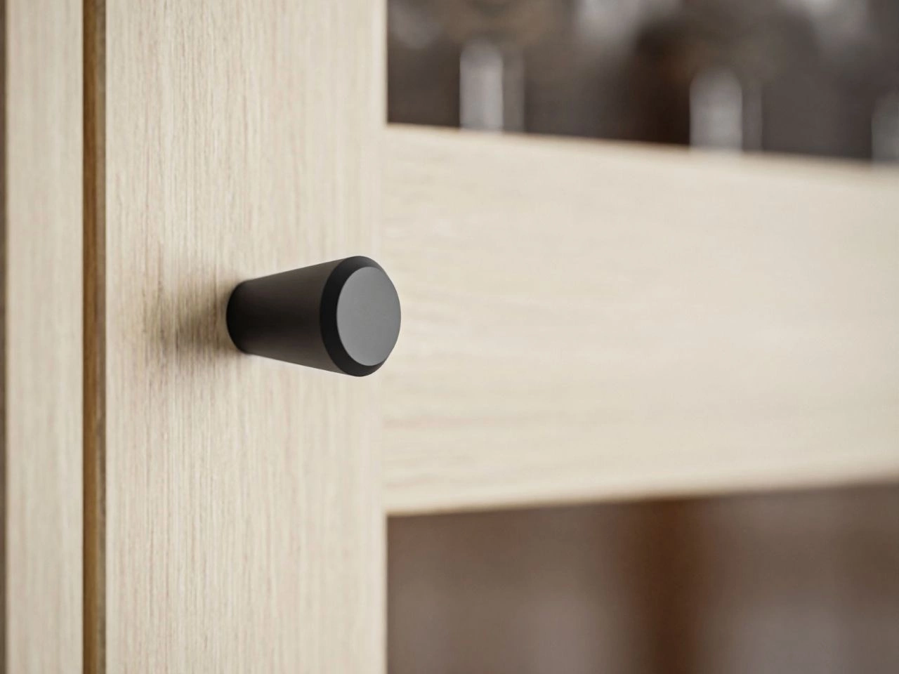 Das präsentierte Möbelstück besteht aus hochwertiger laminierter Platte, deren Kanten mit ABS-Umleimer geschützt sind. Dadurch ist die Vitrine besser vor Kratzern und kleineren mechanischen Beschädigungen geschützt. Sowohl Korpus als auch Front sind in matter Ausführung gehalten. Die Tür wird über einen dezenten Metallgriff geöffnet, und das Ganze steht auf formschönen Metallfüßen.