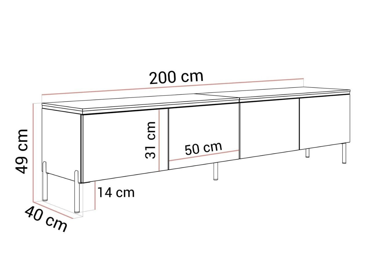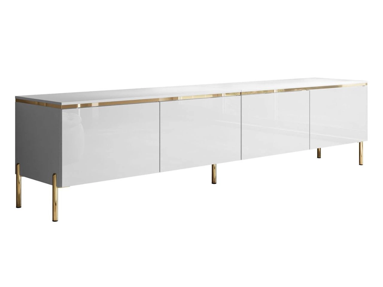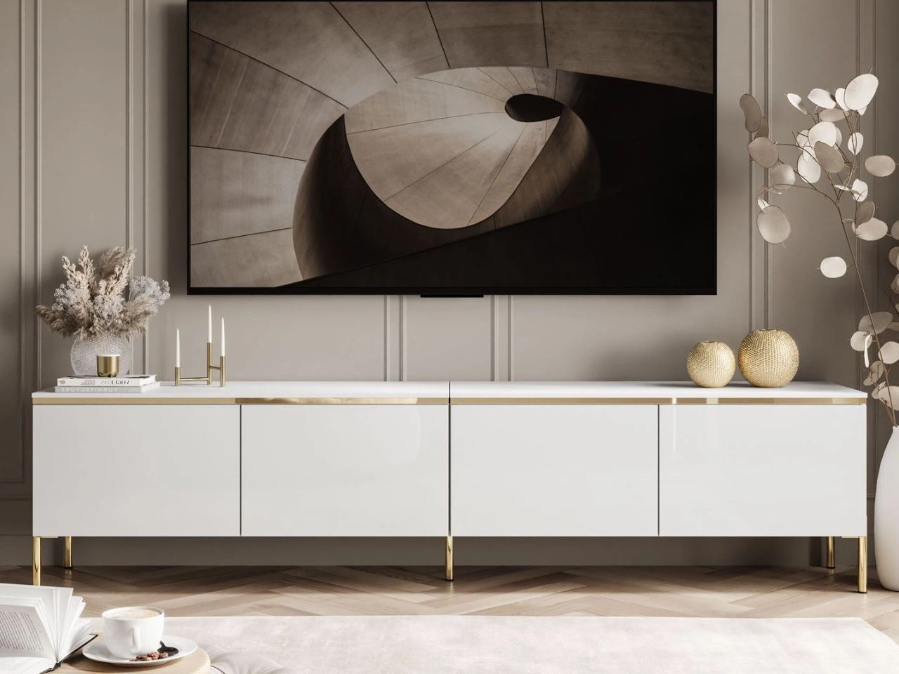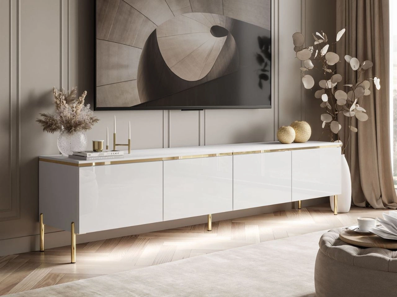 Das viertürige TV-Lowboard Celle ist ein minimalistisches Modell, das sowohl zur modernen Gestaltung als auch zum Glamour-Stil passt. Gefertigt aus hochwertiger laminierter Platte: die Front in Hochglanz, Deckplatte und Korpus matt. Stilvolle goldene Details – eine Zierleiste im oberen Bereich sowie Metallfüße unten – runden das Design ab. Ein unbestreitbarer Vorteil ist die netzbetriebene LED-Beleuchtung, die unter dem TV-Lowboard montiert wird.