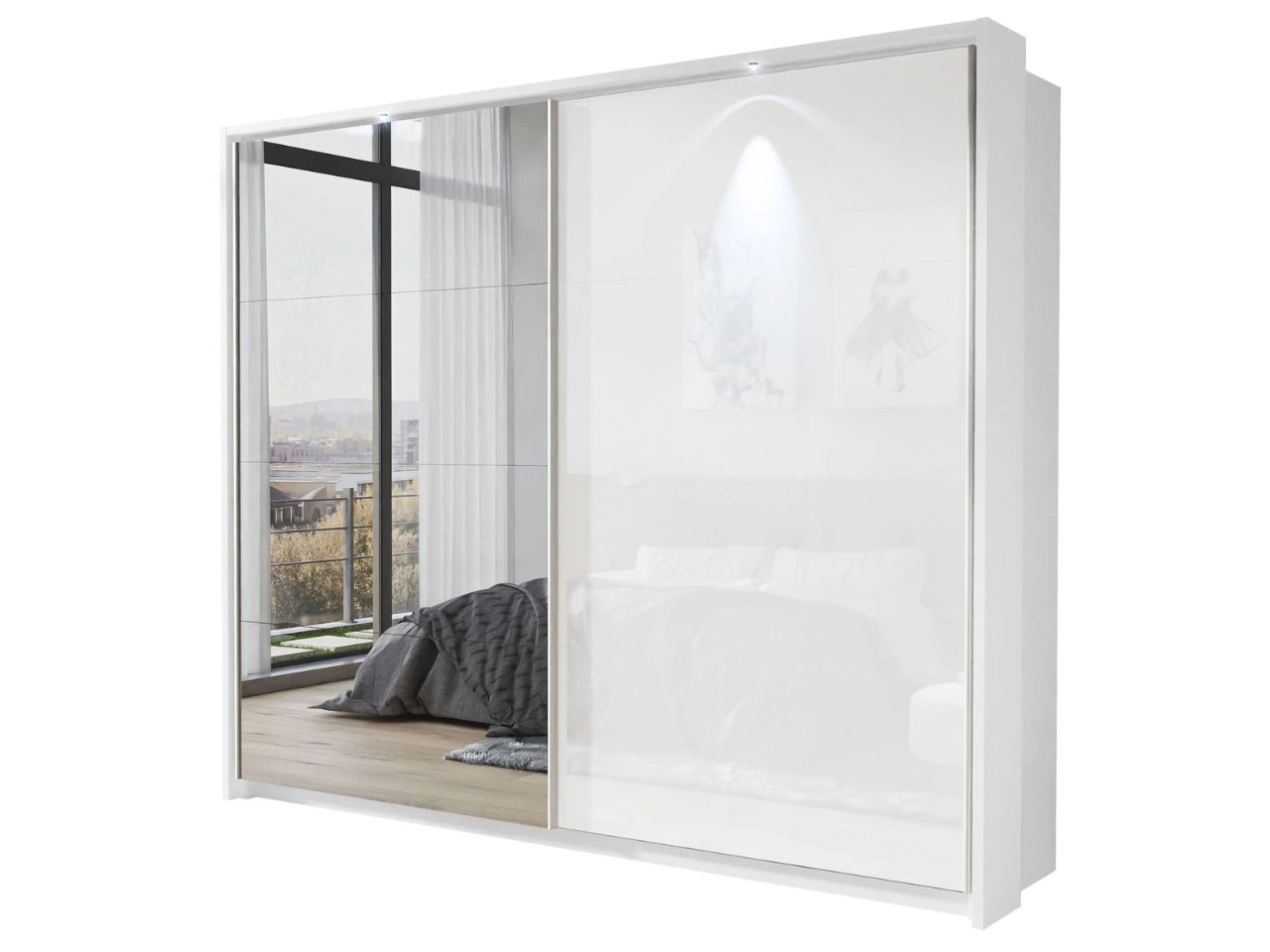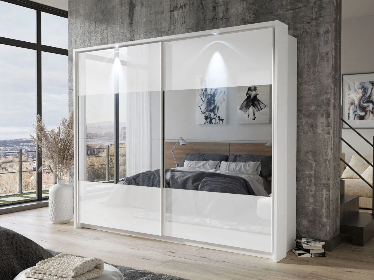 Schwebetürenschrank Zweitüriger mit Aufsatz und Spiegel 254 cm Nuveo Weiß Hochglanz