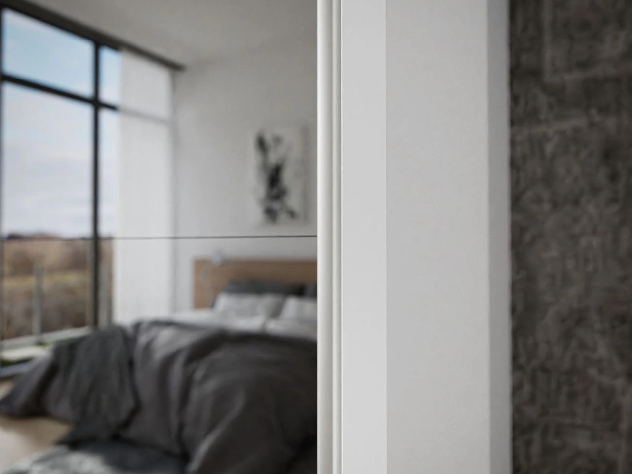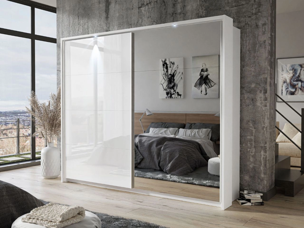 Eine Tür des Schranks ist vollständig mit einem Spiegel versehen, der den Raum optisch vergrößert und Tiefe verleiht, während die andere Tür in Weiß Hochglanz ausgeführt ist, wodurch ein eleganter Kontrast entsteht und der moderne Charakter des Möbelstücks betont wird. Dank robuster Schienen lassen sich die Türen sanft und leise verschieben, was Platz spart und die tägliche Nutzung erleichtert.