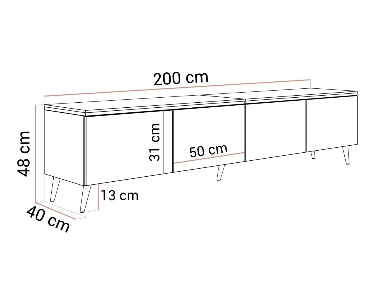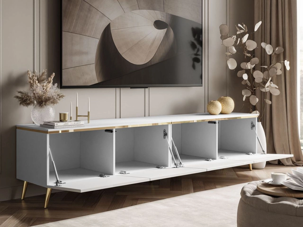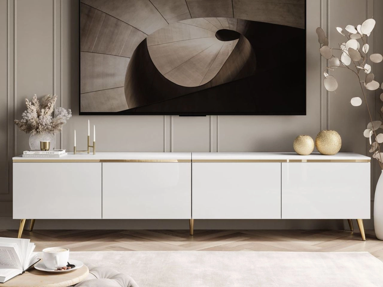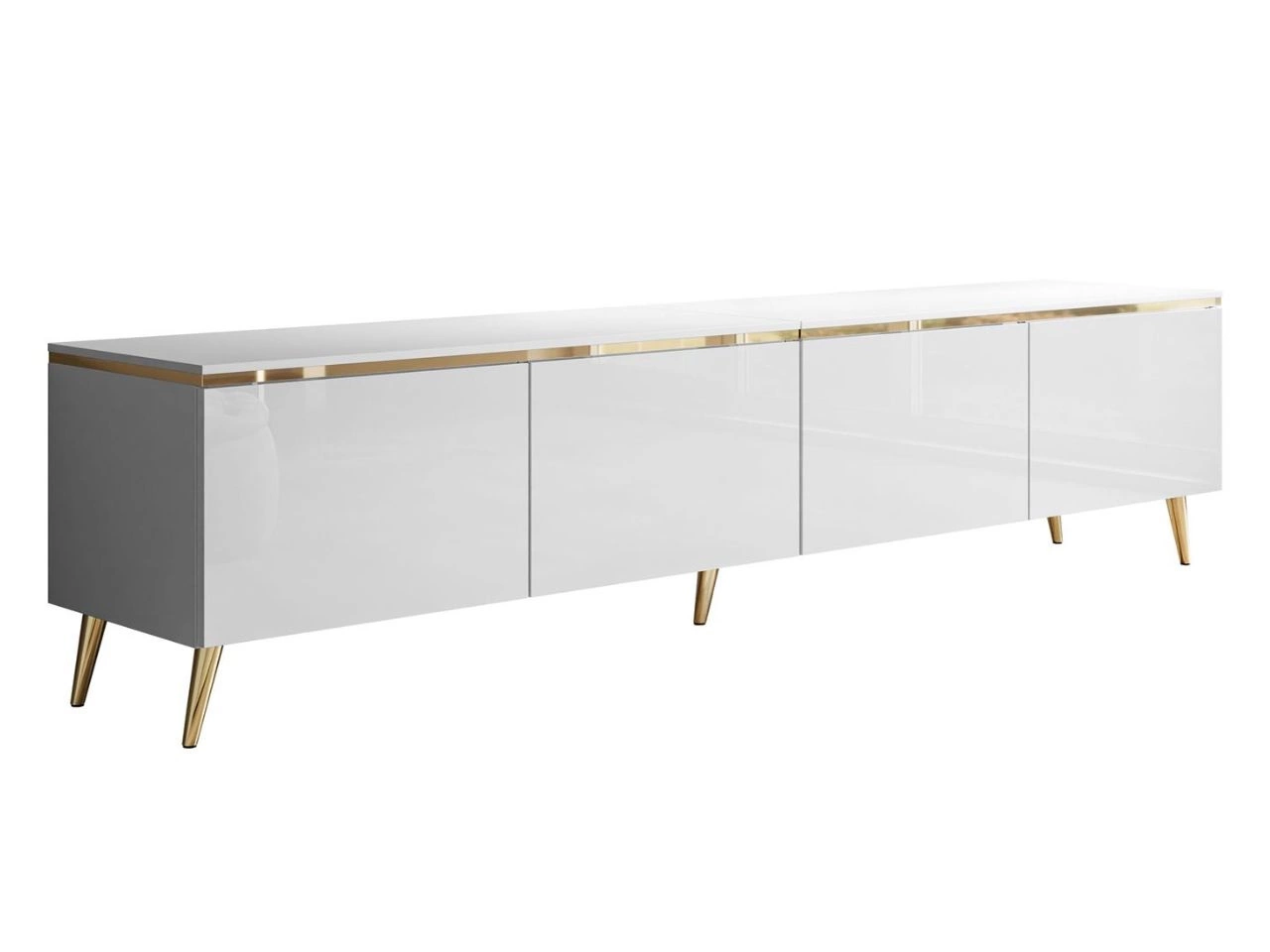 Das viertürige TV-Lowboard Celle ist ein minimalistisches Modell, das sowohl zur modernen Gestaltung als auch zum Glamour-Stil passt. Gefertigt aus hochwertiger laminierter Platte: die Front in Hochglanz, Deckplatte und Korpus matt. Stilvolle goldene Details – eine Zierleiste im oberen Bereich sowie Metallfüße unten – runden das Design ab. Ein unbestreitbarer Vorteil ist die netzbetriebene LED-Beleuchtung, die unter dem TV-Lowboard montiert wird.
