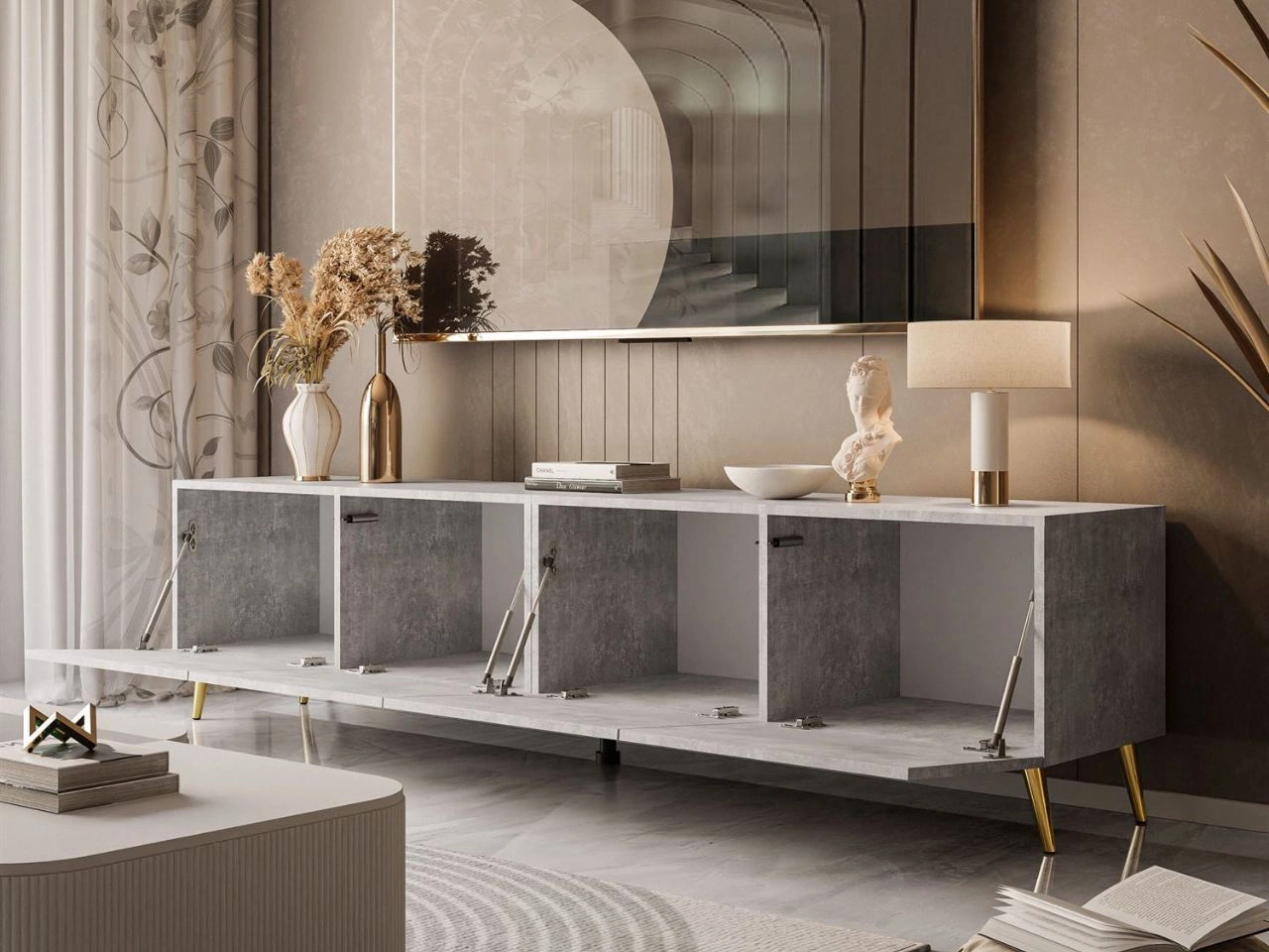 Du ziehst an: TV-Lowboard mit Türen auf Goldenen Metallbeinen 200 cm Nodoo Beton