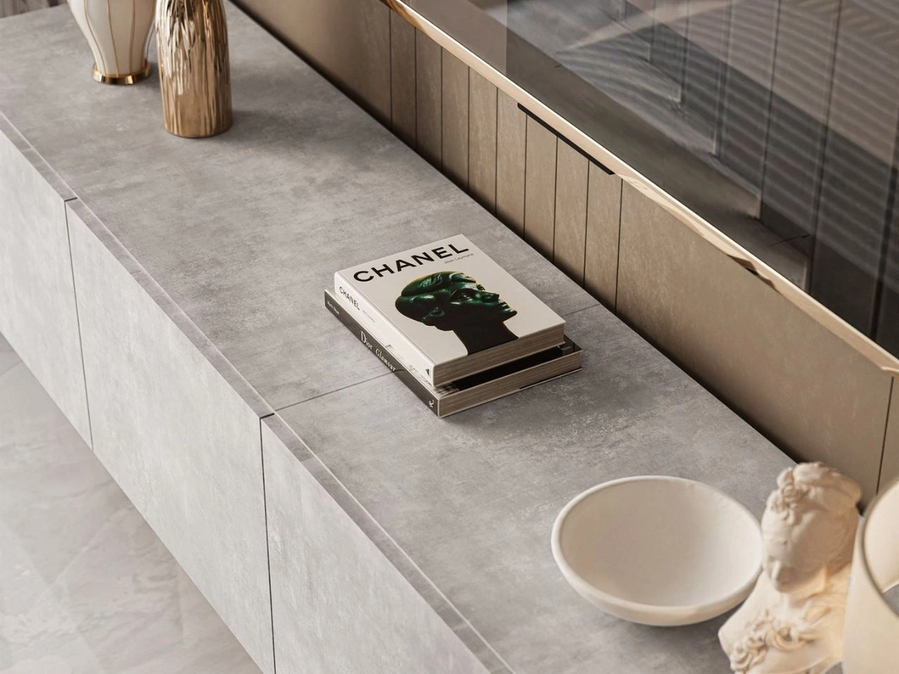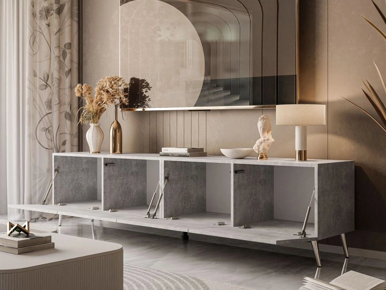 Suchen Sie ein modernes TV-Lowboard, das Ihrem Wohnzimmer Eleganz und Funktionalität verleiht? Modell Nodoo in der Ausführung Beton Belatto ist die ideale Lösung für alle, die Schlichtheit, praktische Details und ein designorientiertes Erscheinungsbild schätzen. Die minimalistische Form und die glatten Fronten fügen sich perfekt in industrielle, moderne oder glamouröse Einrichtungen ein.
