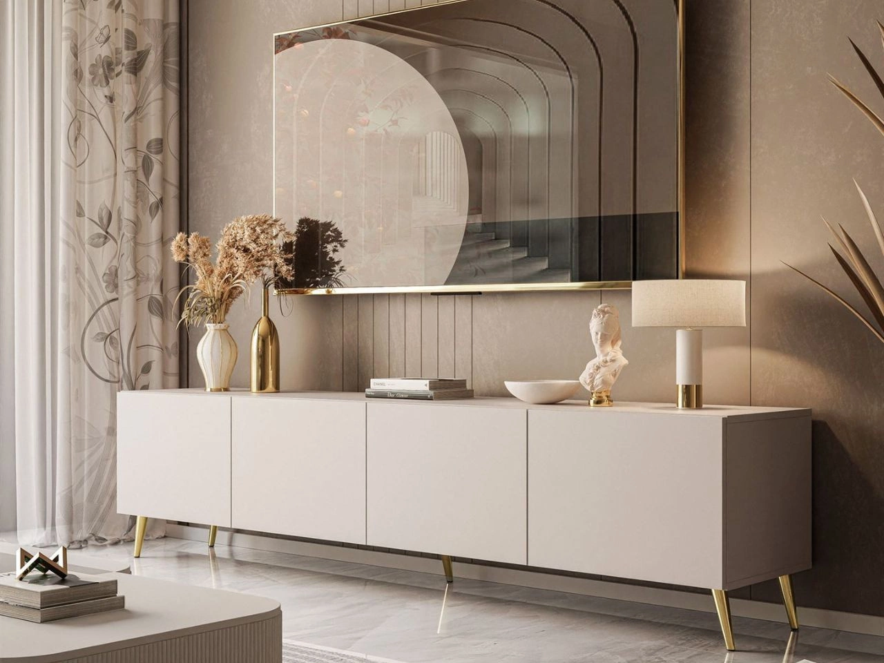 Suchen Sie ein modernes TV-Lowboard, das Ihrem Wohnzimmer Eleganz und Funktionalität verleiht? Modell Nodoo in der Ausführung Kaschmir ist die ideale Lösung für alle, die Schlichtheit, praktische Details und ein designorientiertes Erscheinungsbild schätzen. Die minimalistische Form und die glatten Fronten fügen sich perfekt in industrielle, moderne oder glamouröse Einrichtungen ein.