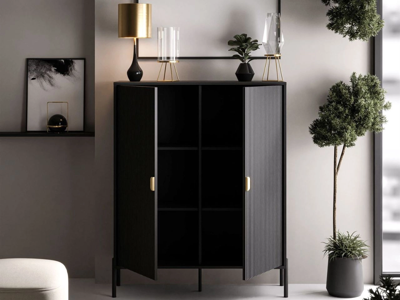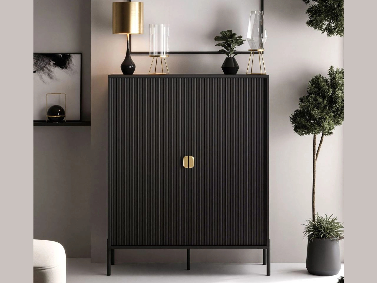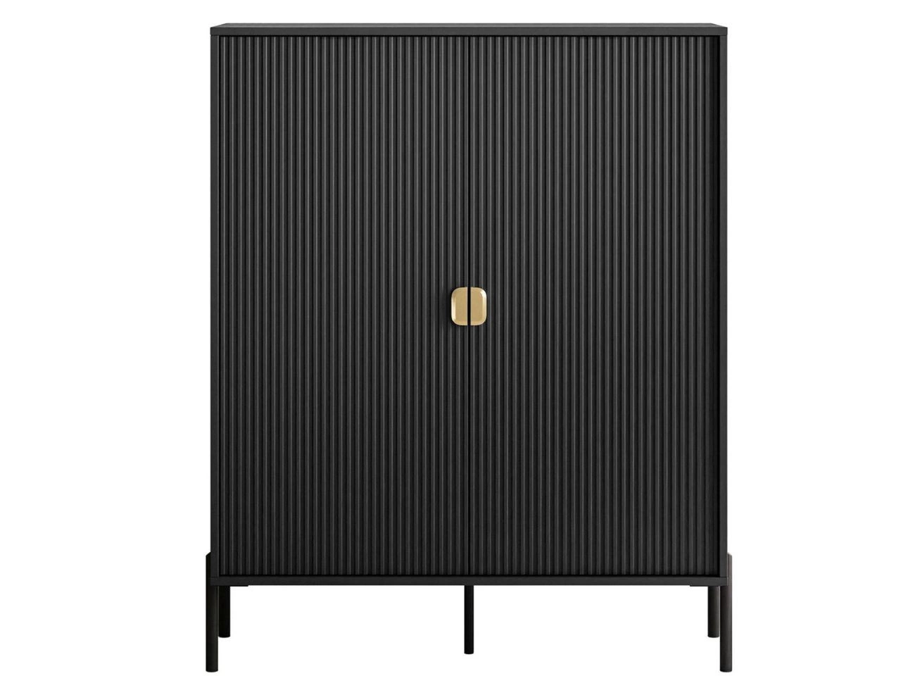 Die zweitürige hohe Kommode Orlean wurde mit Liebe zum Detail gefertigt. Jedes Element ist durchdacht gestaltet und fügt sich perfekt ins Gesamtbild. Zuerst fallen die geriffelten Fronten ins Auge, auf denen goldfarbene, halbkreisförmige Metallgriffe markant zur Geltung kommen. Beim zweiten Blick entdeckt man die hohen schwarzen Metallfüße, deren schlanke Form der Kommode optische Leichtigkeit verleiht und sie besonders elegant wirken lässt.