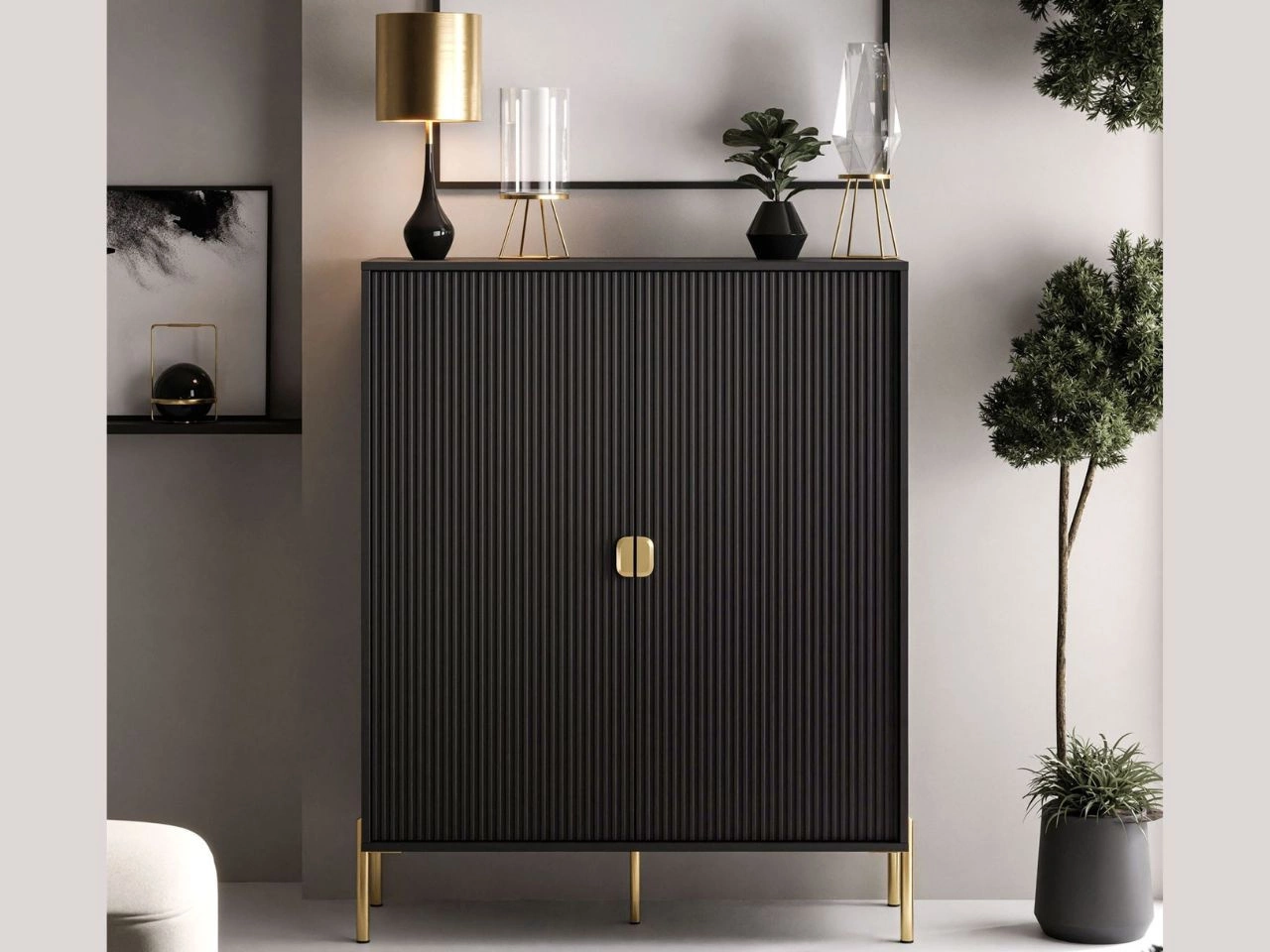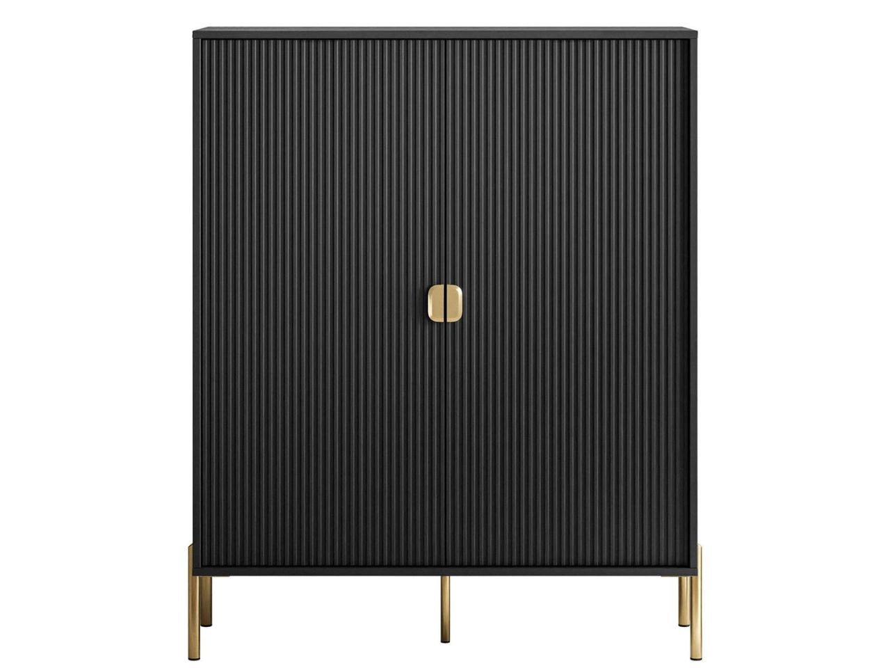 Hohe Kommode, zweitürig, mit goldfarbenen Griffen und Füßen, Orlean schwarz matt