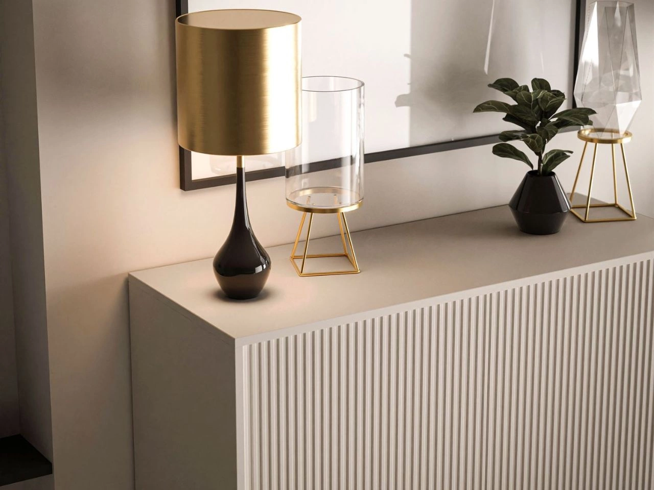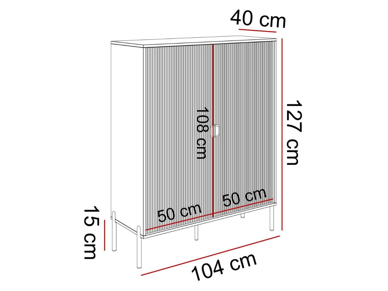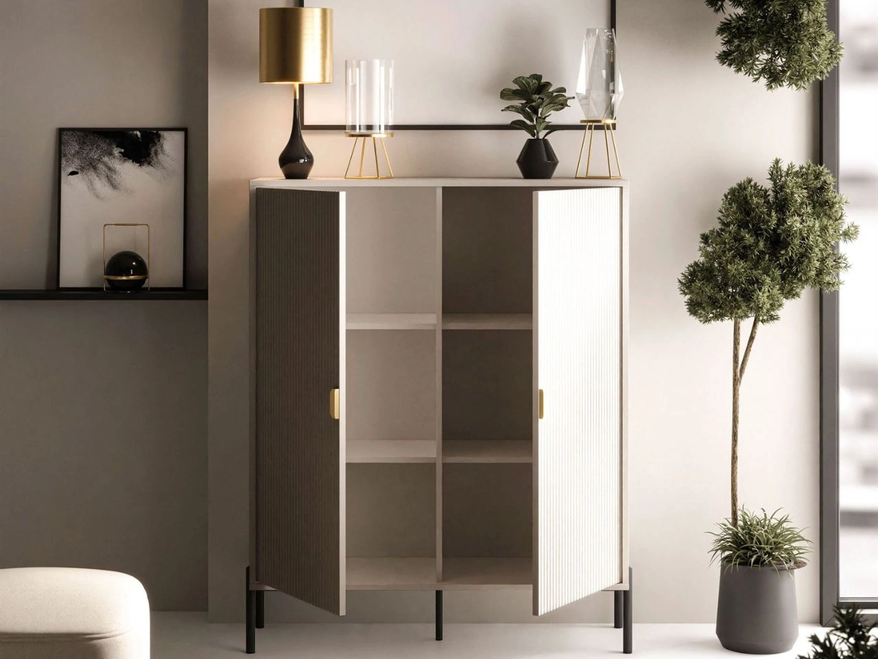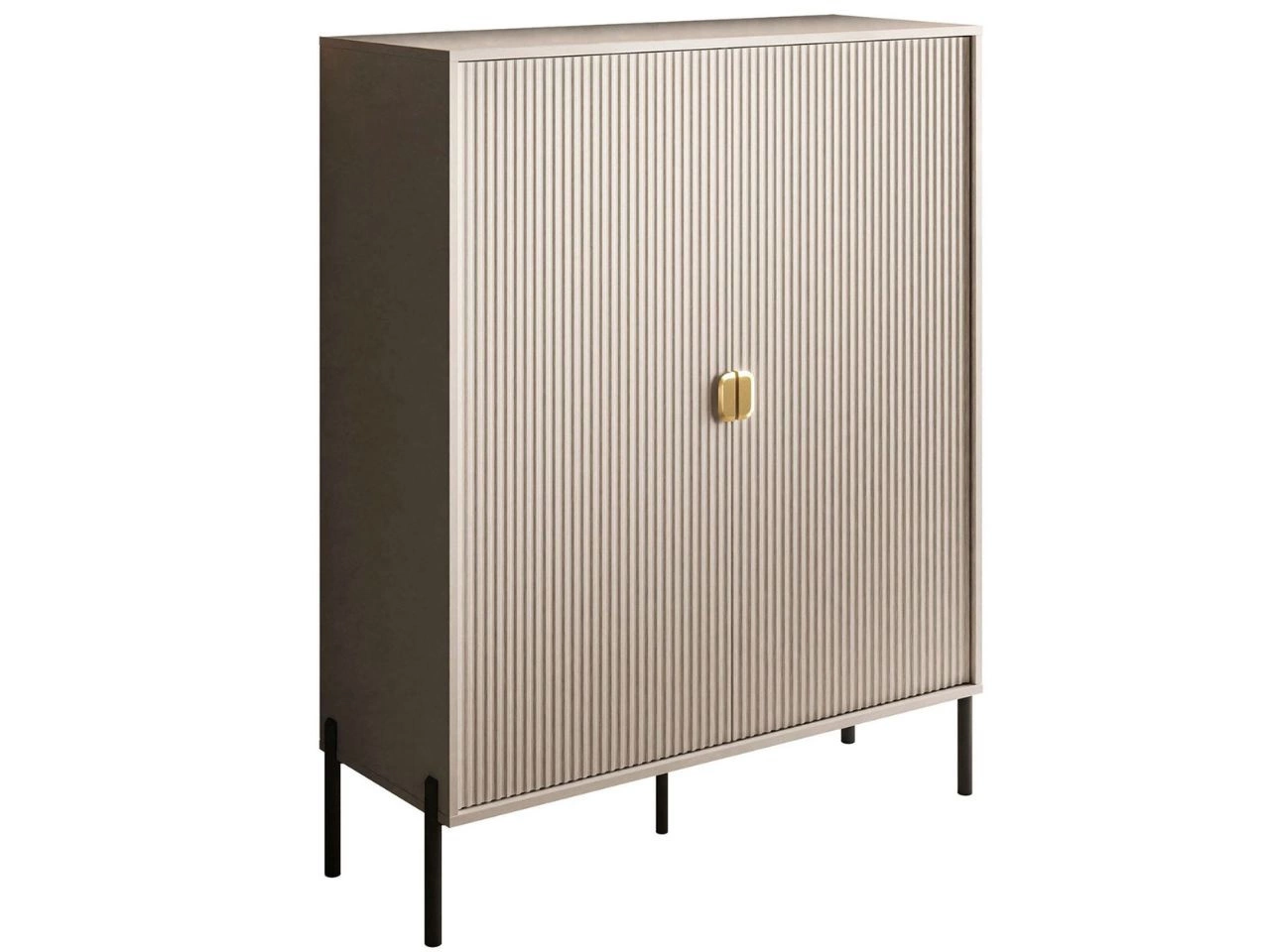Die zweitürige hohe Kommode Orlean wurde mit Liebe zum Detail gefertigt. Jedes Element ist durchdacht gestaltet und fügt sich perfekt ins Gesamtbild. Zuerst fallen die geriffelten Fronten ins Auge, auf denen goldfarbene, halbkreisförmige Metallgriffe markant zur Geltung kommen. Beim zweiten Blick entdeckt man die hohen schwarzen Metallfüße, deren schlanke Form der Kommode optische Leichtigkeit verleiht und sie besonders elegant wirken lässt.