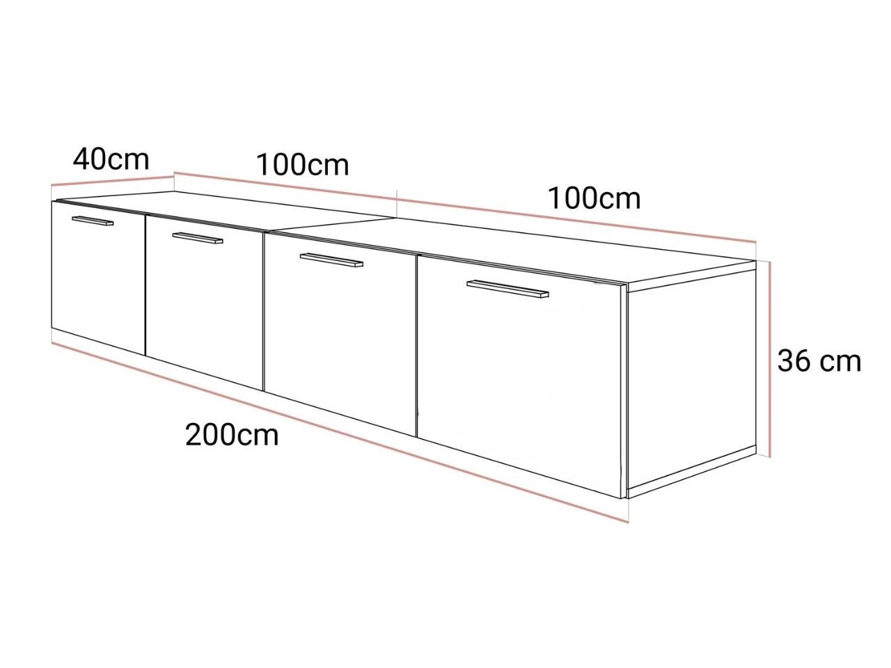 Korpus des Möbelstücks aus strapazierfähiger laminierter Platte garantiert Langlebigkeit, während die elegante Oberfläche dem Ganzen einen modernen Charakter verleiht. Die Fronten wurden mit ABS-kanten und Acryl versehen, die ihre Widerstandsfähigkeit gegen Beschädigungen erhöhen und die Ästhetik des Möbels unterstreichen. Dank der eingesetzten Dämpfer und des Push-to-Open-Systems lassen sie sich leicht und sanft öffnen – sowohl nach oben als auch nach unten – und bewahren dabei ein modernes, einheitliches Erscheinungsbild. Die breite Oberplatte des Schranks bietet den idealen Platz für RTV-Geräte, Dekorationen oder Beleuchtung.