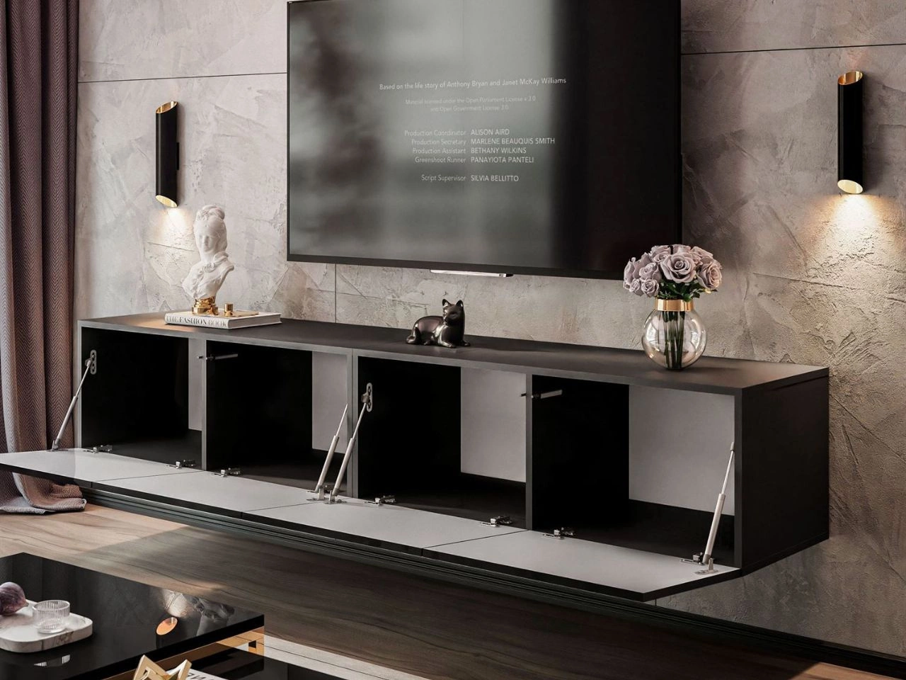 Hängende Ausführung des TV-Schranks erleichtert nicht nur die Reinigung und schafft zusätzlichen Platz unter dem Möbelstück, sondern ist zudem mit einer praktischen LED-Beleuchtung ausgestattet, die das moderne Design unterstreicht.