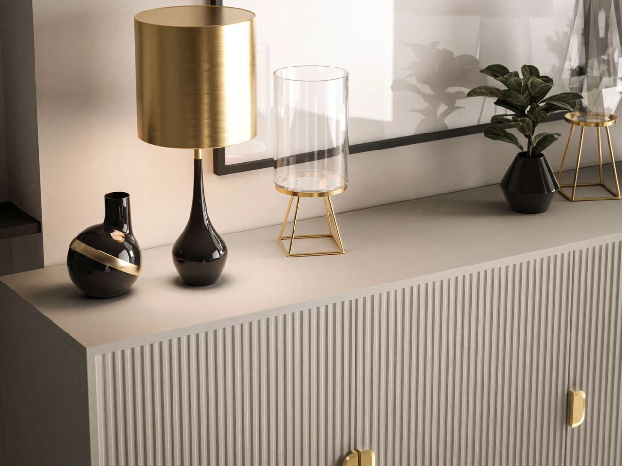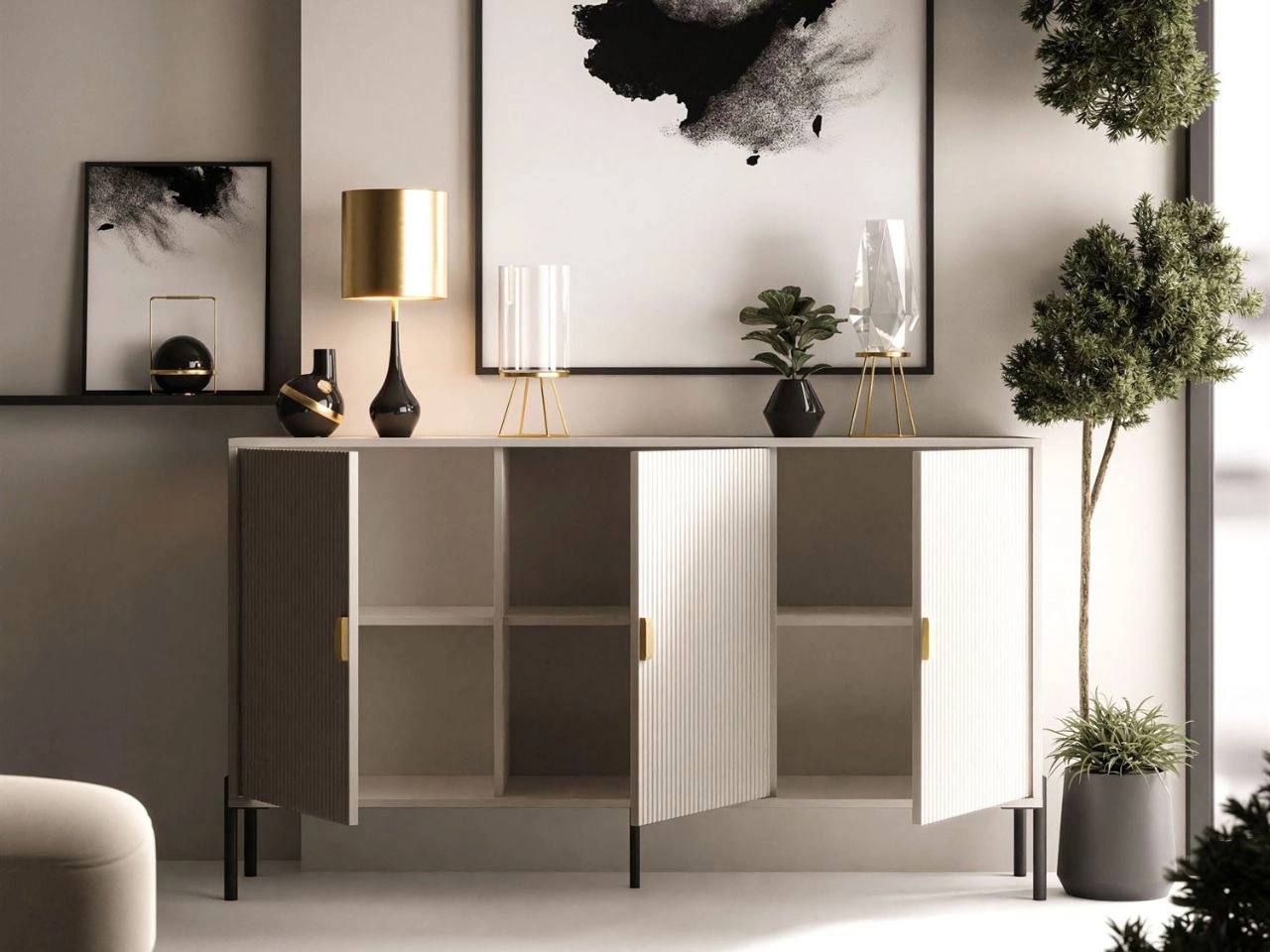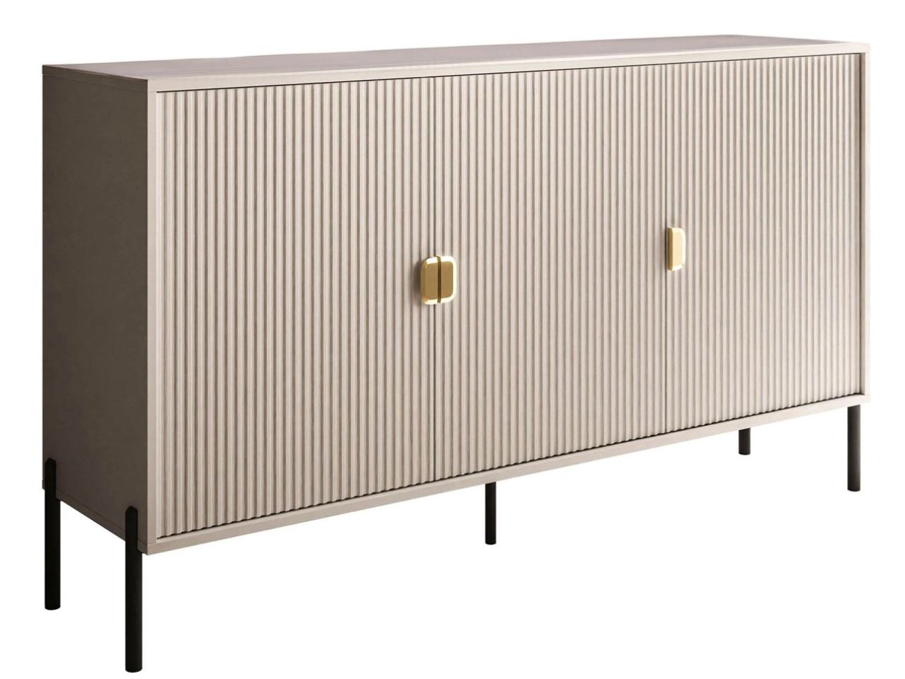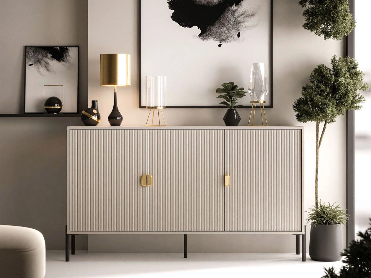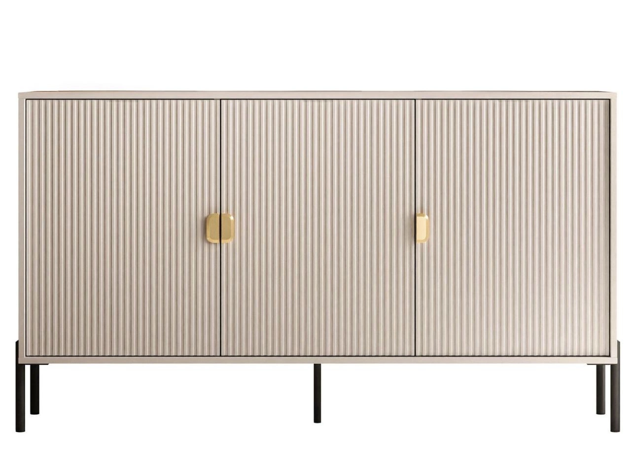 Die dreitürige Kommode Orlean in Kaschmir Matt überzeugt mit einem sorgfältig ausgearbeiteten Korpus und Details, die ins Auge fallen: goldene Metallgriffe auf geriffelten Fronten sowie schlanke, hohe Metallfüße verleihen der Form optische Leichtigkeit. Die großzügige Abdeckplatte bietet zudem reichlich Platz für Deko – oder auch einen großen Fernseher – und erhöht so die Alltagstauglichkeit.