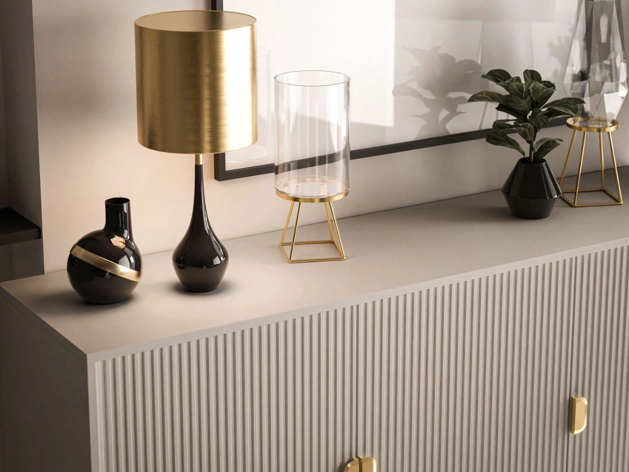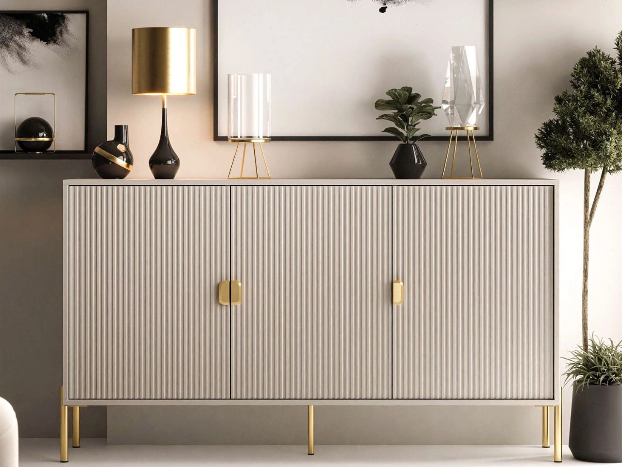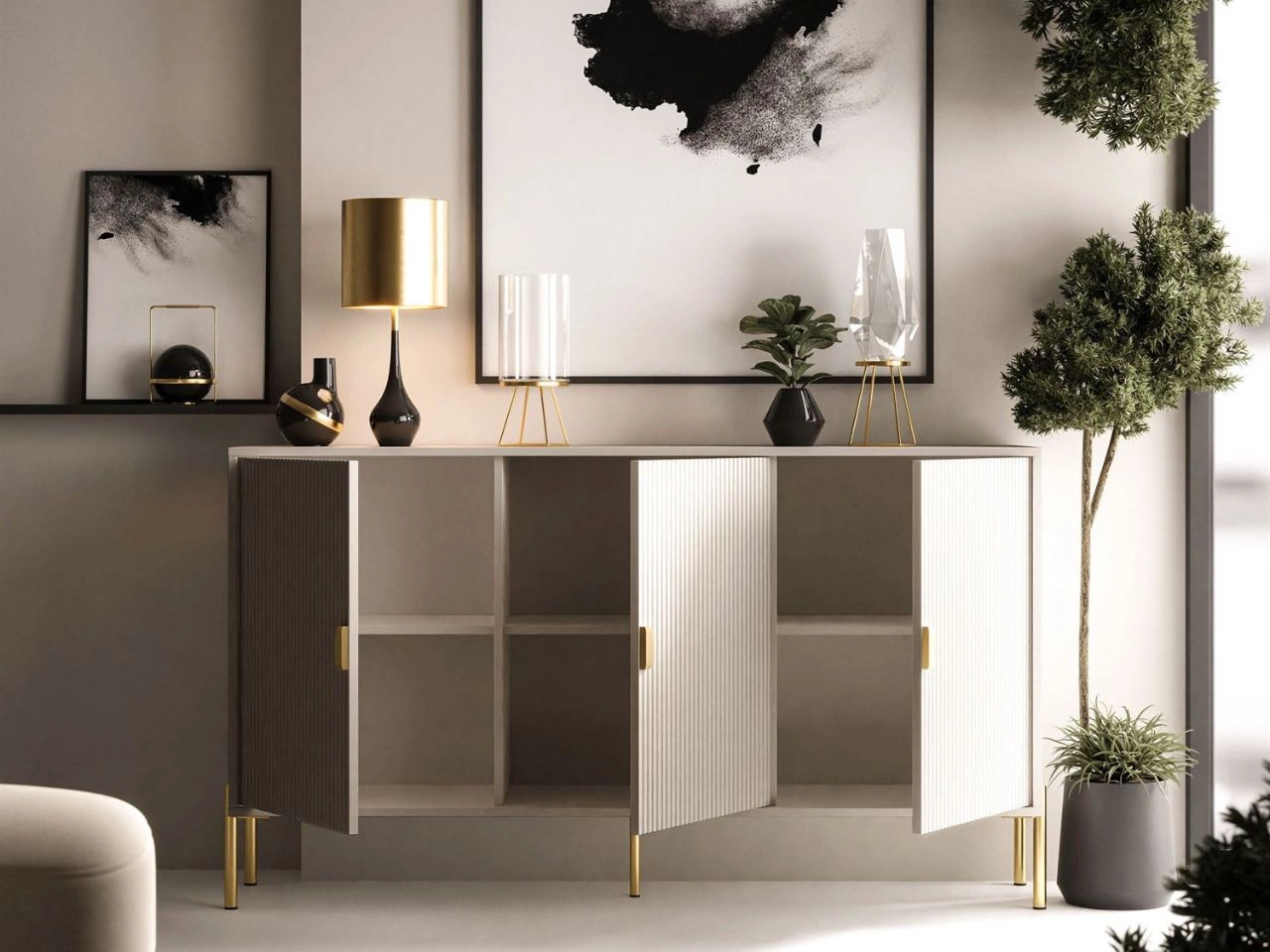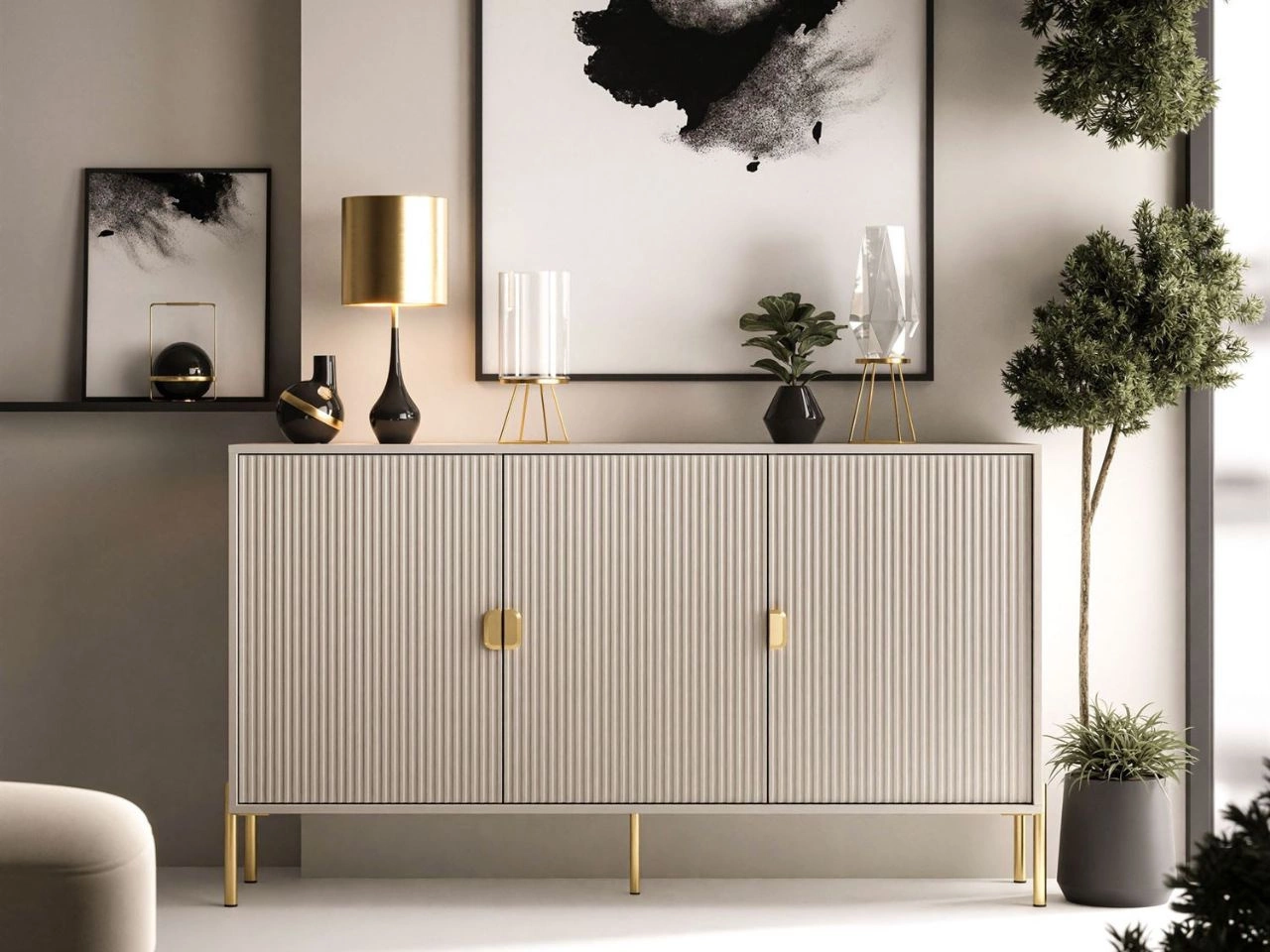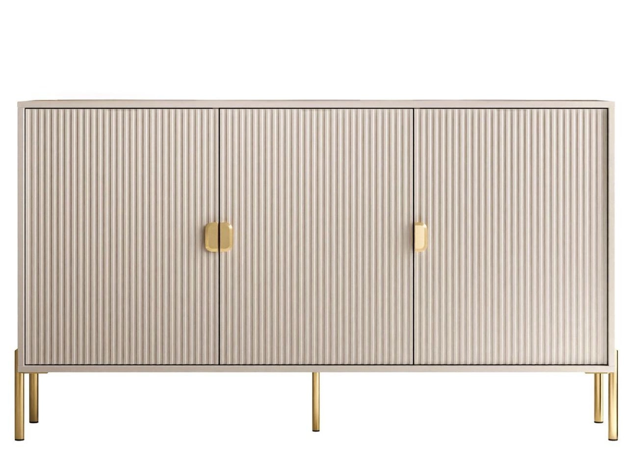 Die dreitürige Kommode Orlean in Kaschmir Matt überzeugt mit einem sorgfältig ausgearbeiteten Korpus und Details, die ins Auge fallen: goldene Metallgriffe auf geriffelten Fronten sowie schlanke, hohe Metallfüße verleihen der Form optische Leichtigkeit. Die großzügige Abdeckplatte bietet zudem reichlich Platz für Deko – oder auch einen großen Fernseher – und erhöht so die Alltagstauglichkeit.