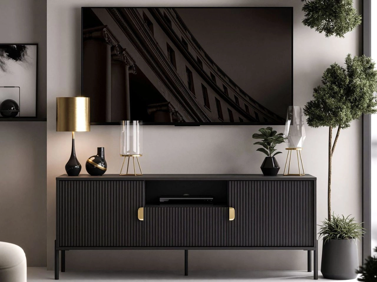 Orlean-Kollektion: Zwei Kommodengrößen (hoch und breit) sowie TV-Lowboards in zwei Breiten. Zur Wahl stehen Schwarz Matt und Kaschmir Matt sowie Füße in Schwarz oder Gold – für eine passgenaue Abstimmung auf Ihr Interieur.