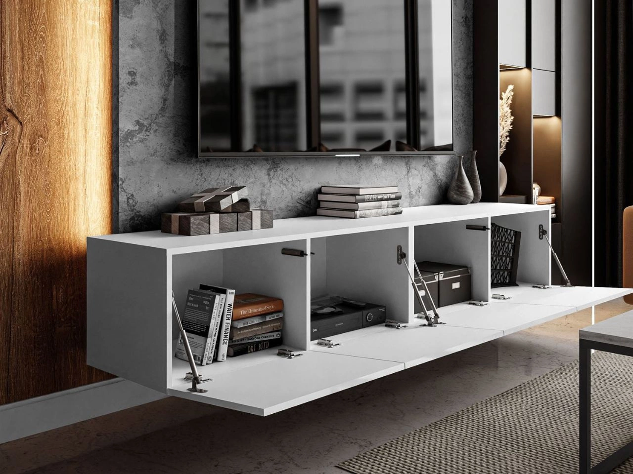 Korpus des Möbelstücks aus strapazierfähiger laminierter Platte garantiert Langlebigkeit, während die elegante Oberfläche dem Ganzen einen modernen Charakter verleiht. Die Fronten sind mit Acryl im Hochglanz veredelt, was ihre Widerstandsfähigkeit gegen Beschädigungen erhöht und dem Möbel ein edles Aussehen verleiht. Dank des Push-to-Open-Systems lassen sie sich leicht und sanft öffnen – sowohl nach oben als auch nach unten – und bewahren dabei eine moderne, einheitliche Optik. Die breite Oberplatte bietet ausreichend Platz für TV-Geräte, Dekorationen oder Beleuchtung.
