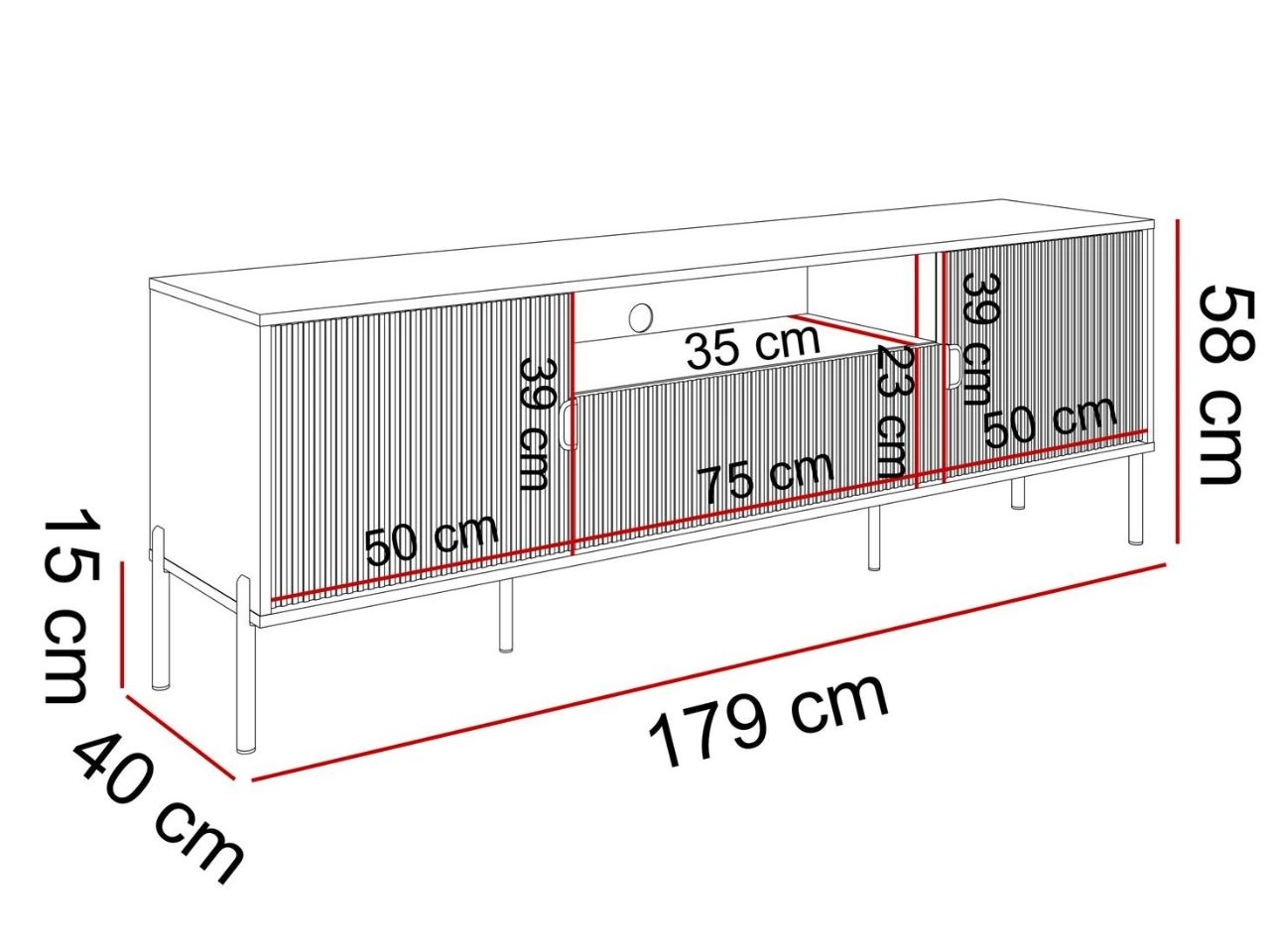 Der TV-Schrank Orlean besteht aus einer hochwertigen laminierten Möbelplatte mit matter Oberfläche. Die Fronten sind mit einer eleganten Riffelstruktur veredelt und mit dezenten goldfarbenen Metallgriffen ausgestattet. Das Möbel bietet zwei Türen und eine Schublade; beide profitieren von einem Soft-Close-Mechanismus, der ein leises Schließen gewährleistet. Über der Schublade befindet sich ein offenes Fach für Receiver oder Konsole, die Rückwand verfügt über einen runden Kabeldurchlass für eine ordentliche Führung der Leitungen.
