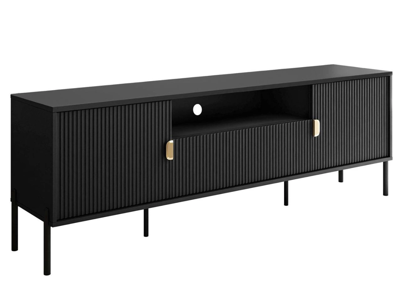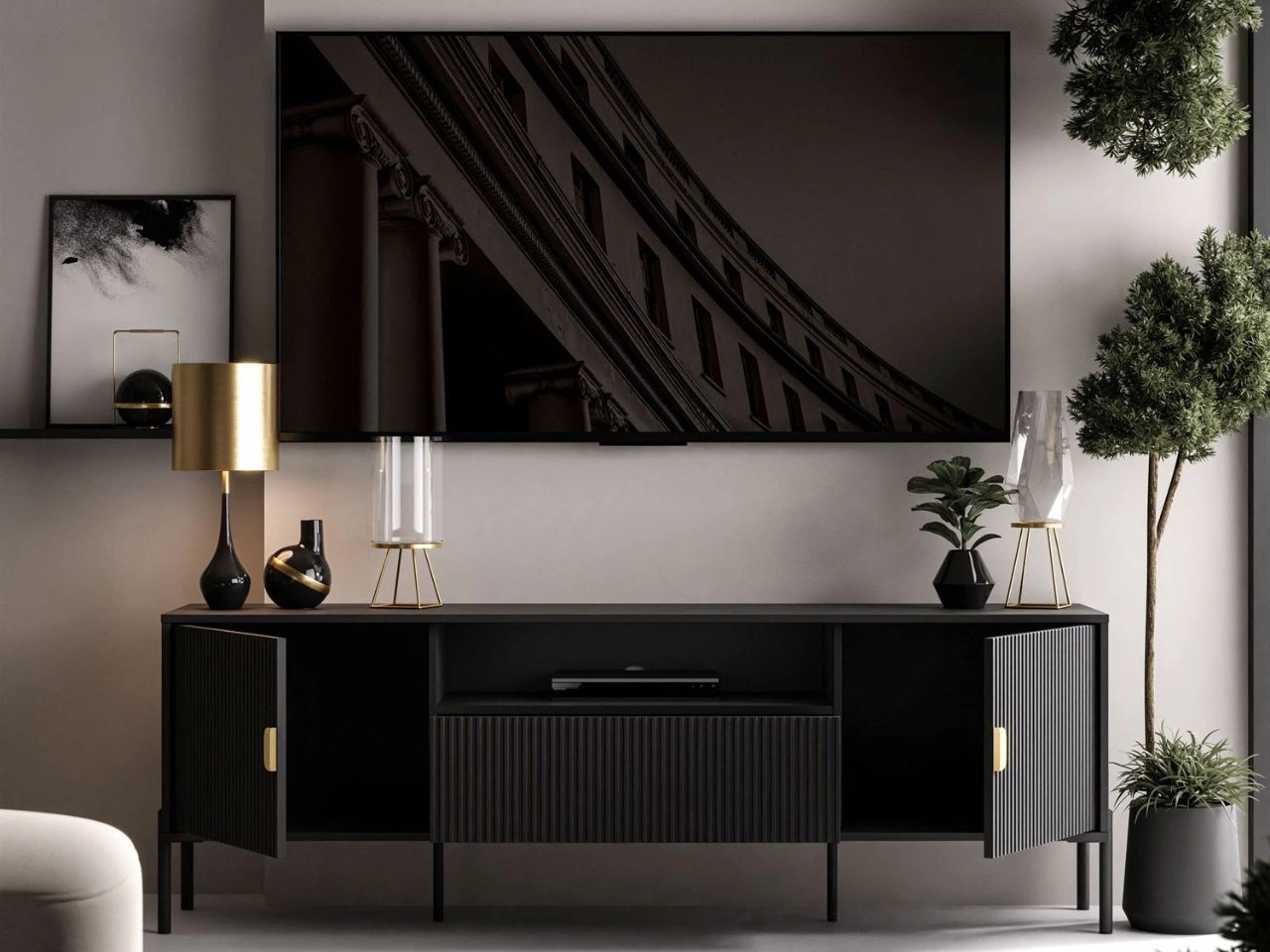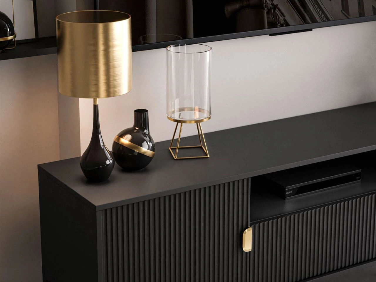Orlean-Kollektion: Zwei Kommodengrößen (hoch und breit) sowie TV-Lowboards in zwei Breiten. Zur Wahl stehen Schwarz Matt und Kaschmir Matt sowie Füße in Schwarz oder Gold – für eine passgenaue Abstimmung auf Ihr Interieur.