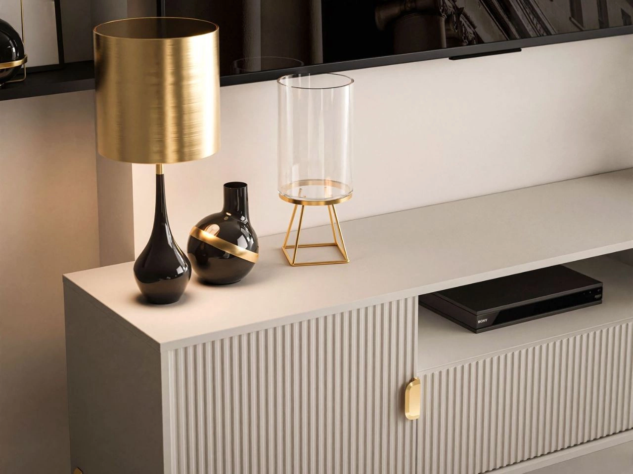 Der TV-Schrank Orlean besteht aus einer hochwertigen laminierten Möbelplatte mit matter Oberfläche. Die Fronten sind mit einer eleganten Riffelstruktur veredelt und mit dezenten goldfarbenen Metallgriffen ausgestattet. Das Möbel bietet zwei Türen und eine Schublade; beide profitieren von einem Soft-Close-Mechanismus, der ein leises Schließen gewährleistet. Über der Schublade befindet sich ein offenes Fach für Receiver oder Konsole, die Rückwand verfügt über einen runden Kabeldurchlass für eine ordentliche Führung der Leitungen.