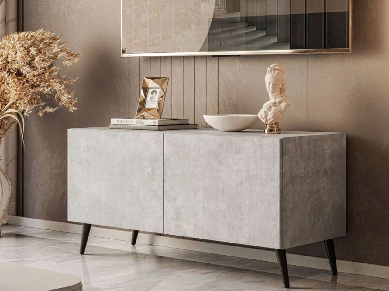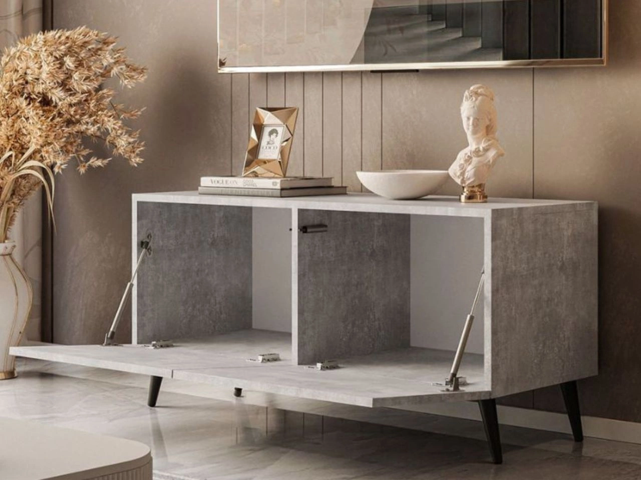 Suchen Sie ein modernes TV-Lowboard, das Ihrem Wohnzimmer Eleganz und Funktionalität verleiht? Modell Nodoo in der Ausführung Beton Belatto ist die ideale Lösung für alle, die Schlichtheit, praktische Details und ein designorientiertes Erscheinungsbild schätzen. Die minimalistische Form und die glatten Fronten fügen sich perfekt in industrielle, moderne oder glamouröse Einrichtungen ein.