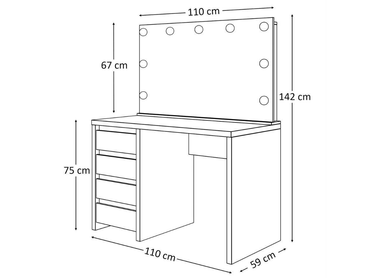 Ein besonderes Highlight des Frisiertischs Nesso ist das breite Spiegel, dessen Fläche von neun LED-Lichtpunkten mit natürlicher, augenschonender Lichtfarbe erhellt wird. Die LED-Beleuchtung wird über das Stromnetz betrieben; ein passendes Anschlusskabel ist im Lieferumfang enthalten.