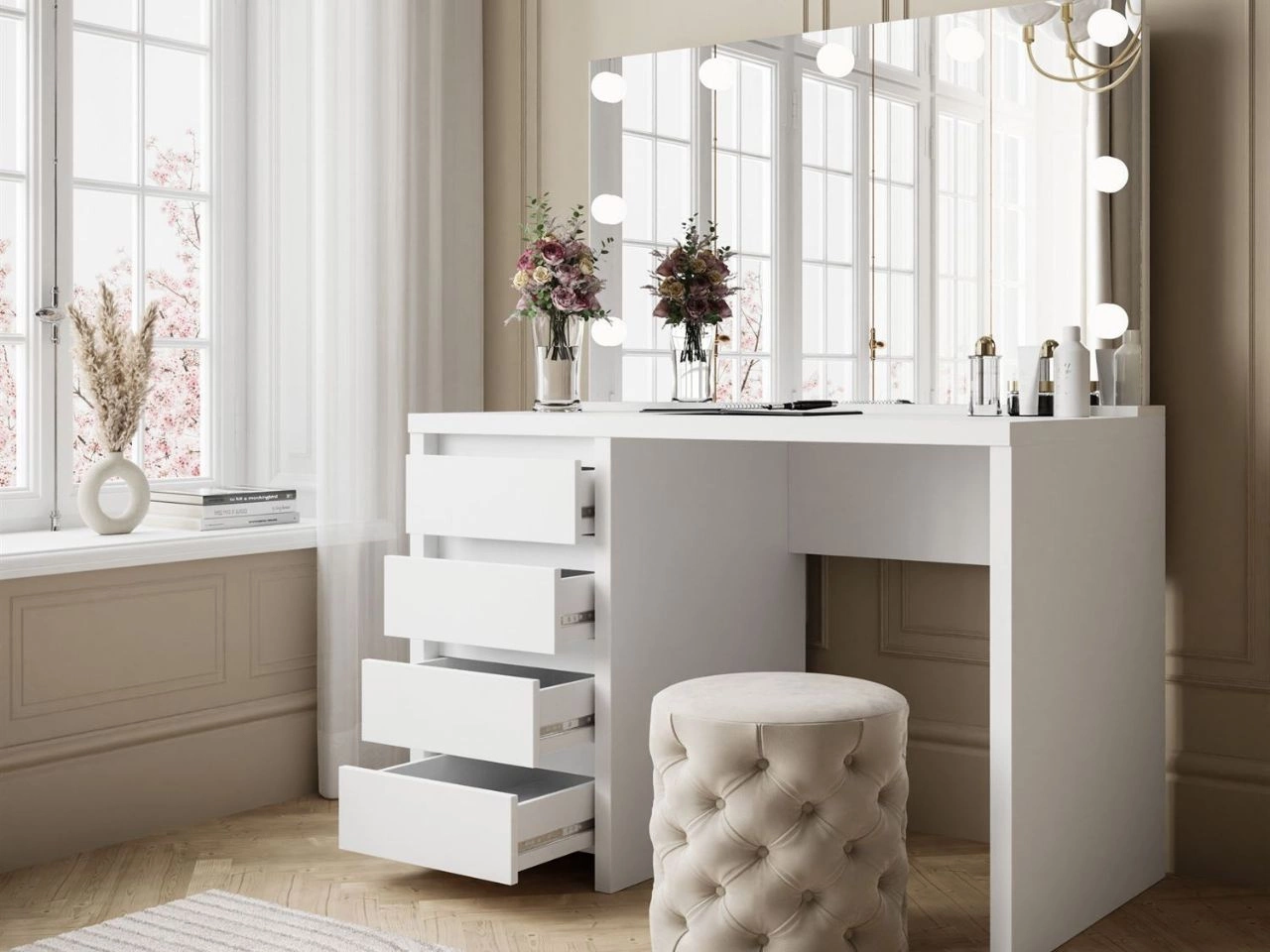 Der Kosmetiktisch Nesso kombiniert durchdachte Konstruktion mit starkem Design. Gefertigt aus einer hochwertigen laminierten Möbelplatte, deren Kanten durch eine ABS-Umleimung vor Kratzern und kleinen Stößen geschützt sind. Unter der Tischplatte befinden sich vier Schubladen, die wahlweise links oder rechts montiert werden können. Die Schubladen laufen auf kugelgelagerten Führungsschienen und bieten Vollauszug für komfortablen Zugriff.