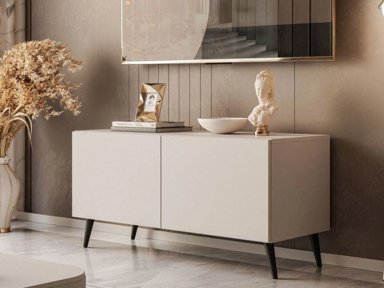 Suchen Sie ein modernes TV-Lowboard, das Ihrem Wohnzimmer Eleganz und Funktionalität verleiht? Modell Nodoo in der Ausführung Kaschmir ist die ideale Lösung für alle, die Schlichtheit, praktische Details und ein designorientiertes Erscheinungsbild schätzen. Die minimalistische Form und die glatten Fronten fügen sich perfekt in industrielle, moderne oder glamouröse Einrichtungen ein.