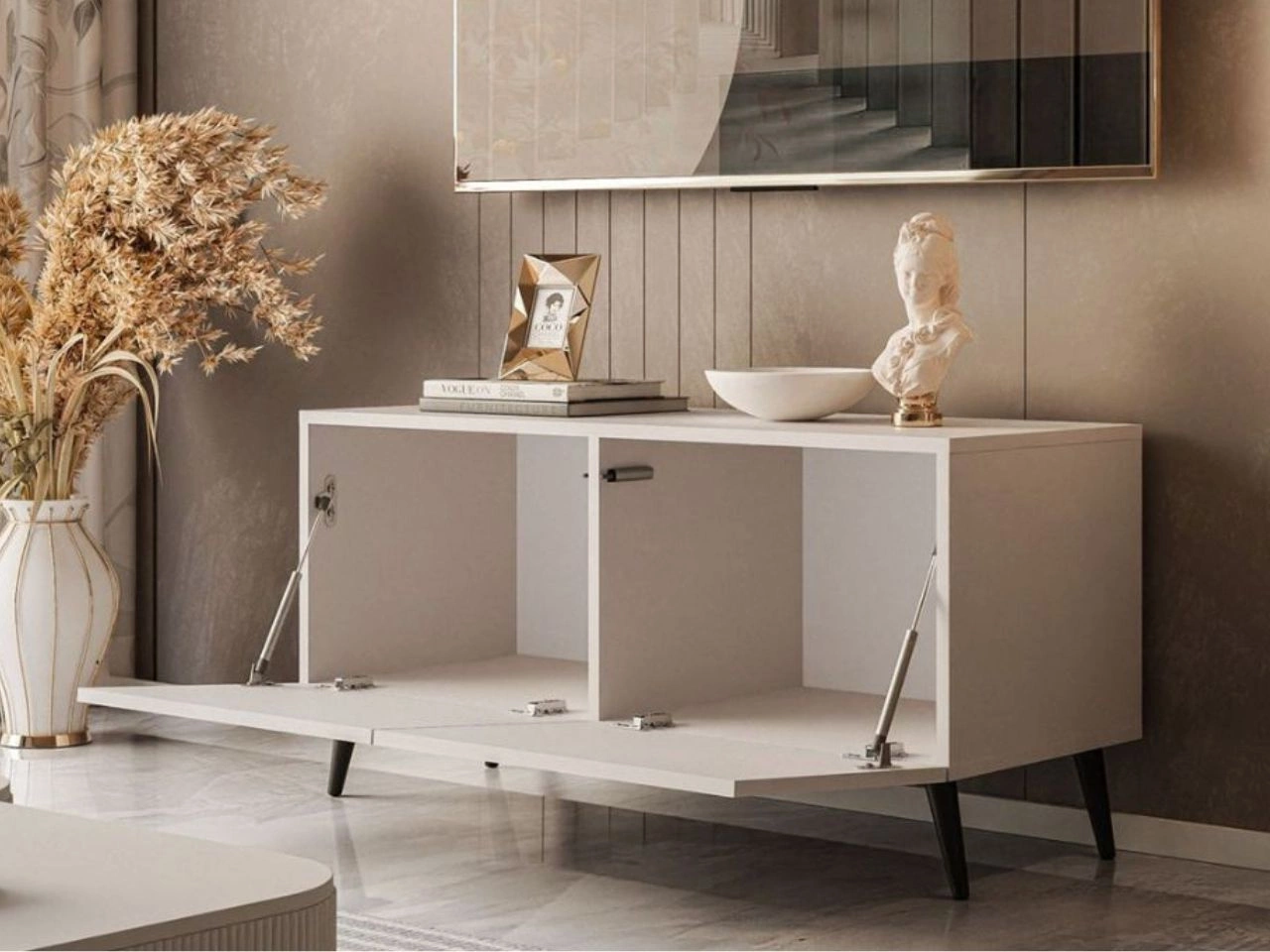 Schlanke, schräge Metallfüße verleihen der Konstruktion Leichtigkeit und Stabilität und erleichtern zudem die Reinigung unter dem Möbelstück. So vereint das Lowboard Eleganz mit Funktionalität und wird zu einem stilvollen Highlight in jedem modernen Wohnzimmer.