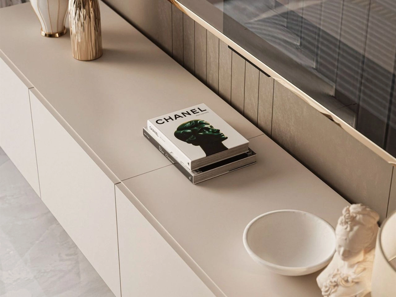 Korpus des TV-Schranks aus strapazierfähiger laminierter Platte sorgt für Langlebigkeit, während die elegante Oberfläche dem Ganzen einen modernen Charakter verleiht. Die Fronten sind mit einer ABS-Kante versehen, die sie widerstandsfähiger gegen Beschädigungen macht und ihre Ästhetik unterstreicht. Dank der eingebauten Gasdruckdämpfer und des Push-to-Open-Systems lassen sich die Türen leicht und sanft sowohl nach oben als auch nach unten öffnen, wodurch die moderne, einheitliche Optik erhalten bleibt. Die breite Ablagefläche bietet Platz für TV-Geräte, Dekorationen oder Beleuchtung.