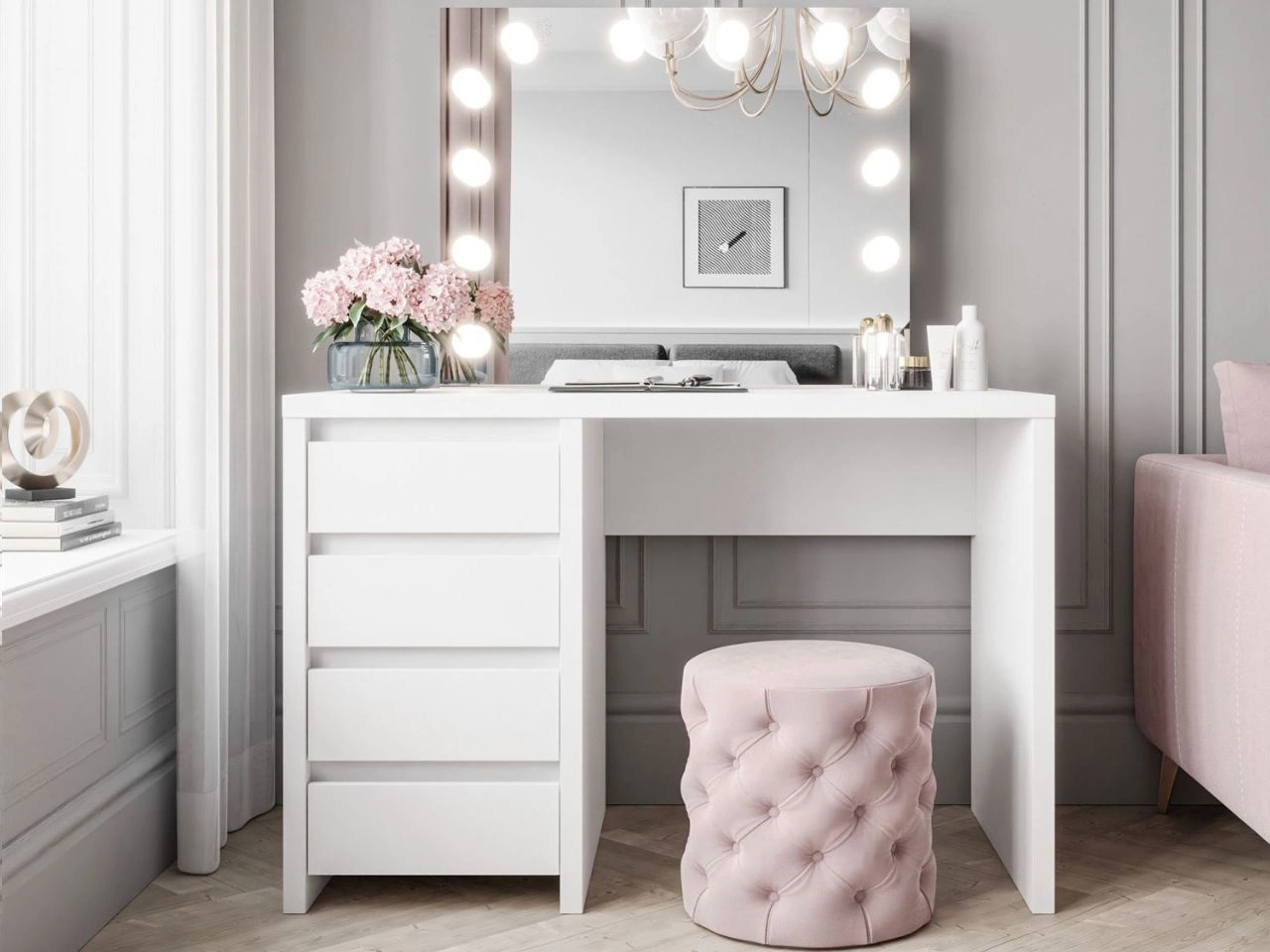 Der Schminktisch Nesso ist ein durchdachtes Modell mit hochwertiger Ausführung. Der Korpus besteht aus einer robusten, hochwertigen laminierten Platte; die Kanten sind mit ABS-Umleimer geschützt – das erhöht die Widerstandsfähigkeit gegen Kratzer und kleine mechanische Beschädigungen. Unter der Tischplatte befinden sich vier Schubladen, die wahlweise links oder rechts montiert werden können. Die Schubladen laufen auf Kugelführungen mit Vollauszug für leichten Zugriff. (Keywords: Schminktisch mit Schubladen, Vollauszug)